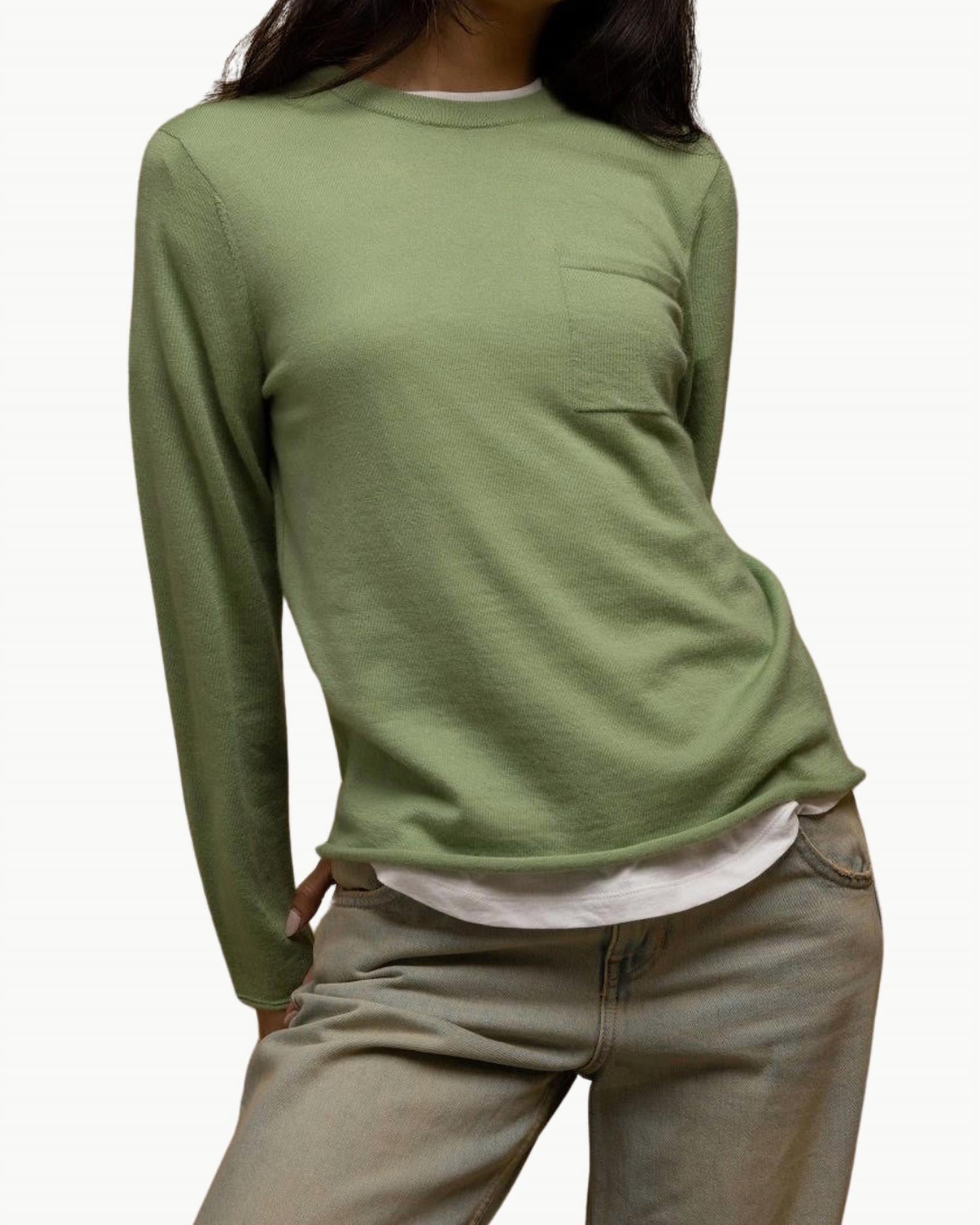 Great fit, cute design, soft fabric. You'll love everything about this long sleeve tee. Introducing the Aina Cashmere T-shirt from 27 Miles Malibu, a masterpiece of cozy elegance in a striking moss hue. Crafted from 100% cashmere, this long sleeve tee offers a soft and breathable experience, featuring a crew neckline and relaxed fit for ultimate comfort. A thoughtfully placed single patch pocket enhances its functionality, while the pull-on closure ensures ease of wear. Ideal for layering or as a standalone piece, this solid pattern shirt embodies minimalist style suitable for any fall vacation occasion.