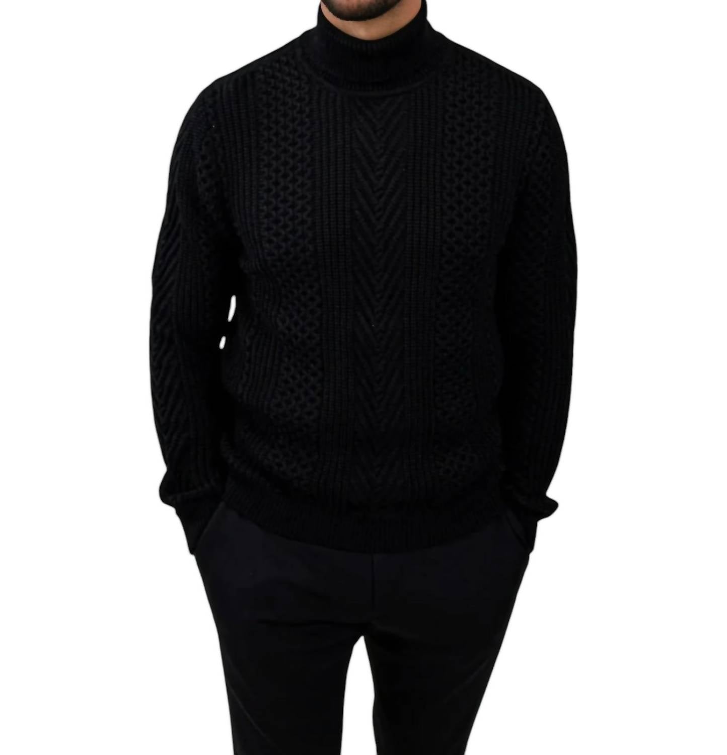 Experience warmth and style. Black, long-sleeve sweater. Crafted from a blend of 60% cotton and 40% acrylic. Ensuring utmost comfort and versatility. Textured pattern adds a chic touch to its design. Pull-on closure offers ease of wear. Merges masterful fit with timeless appeal.