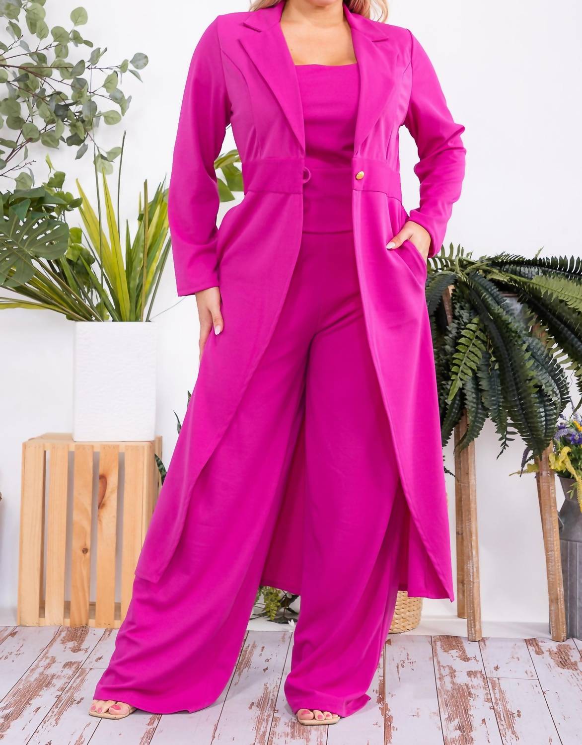 A set so cute you'll never want to take it off. Designed to look good while lounging, this little number is the perfect outfit for hanging at home in style. Elevate your holiday party look with the Solid Three-piece Set by Karen T Design, perfect for Thanksgiving gatherings. This stylish loungewear set includes a long sleeve cape, a sleeveless top, and elastic waist wide-leg pants, all in a vibrant fuchsia hue. Designed with a minimalist trend in mind, this set offers a comfortable yet chic appearance. Ideal for women seeking both style and comfort during the fall season.