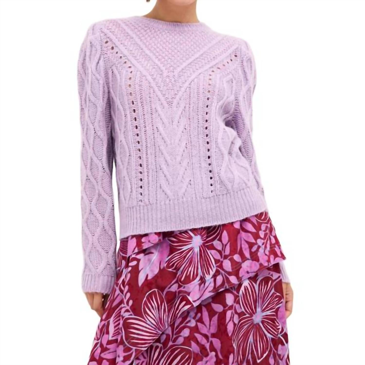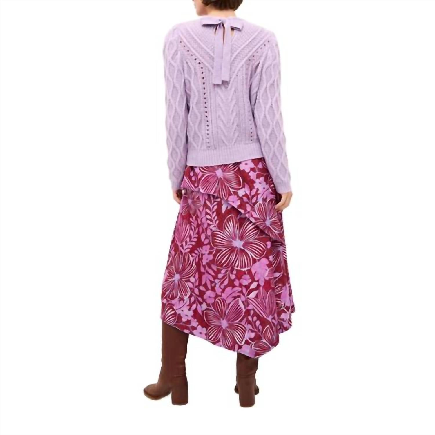 The ultimate go-to sweater, expertly crafted to provide the perfect combination of warmth and style. Its classic design and soft fabric make it a must-have addition to your wardrobe. Cable knit eyelet sweater with bow back