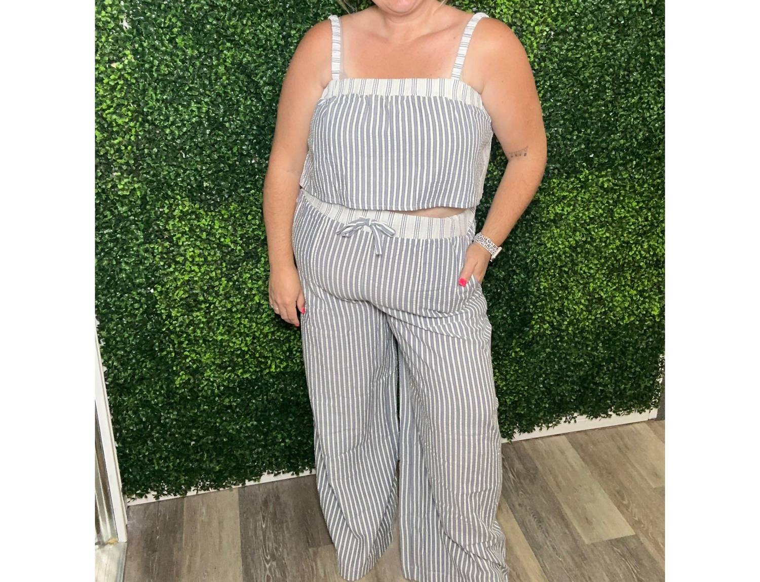 Loungewear doesn't have to be frumpy and this is exactly what we had in mind. Designed for a comfortable fit, this chic little number will be your favorite lounging-at-home look. Embrace effortless style with the Seersucker Pant Set by BLAKELEY, perfect for a breezy summer. This sleeveless tank set in a cotton blend features classic stripe patterns and elastic shoulder straps, paired with matching seersucker pants complete with a contrast elastic waistband and side pockets. Material: 55% Cotton, 45% Poly. Care instructions: Machine washable and safe for tumble drying. Ideal for vacation and Fourth of July celebrations.