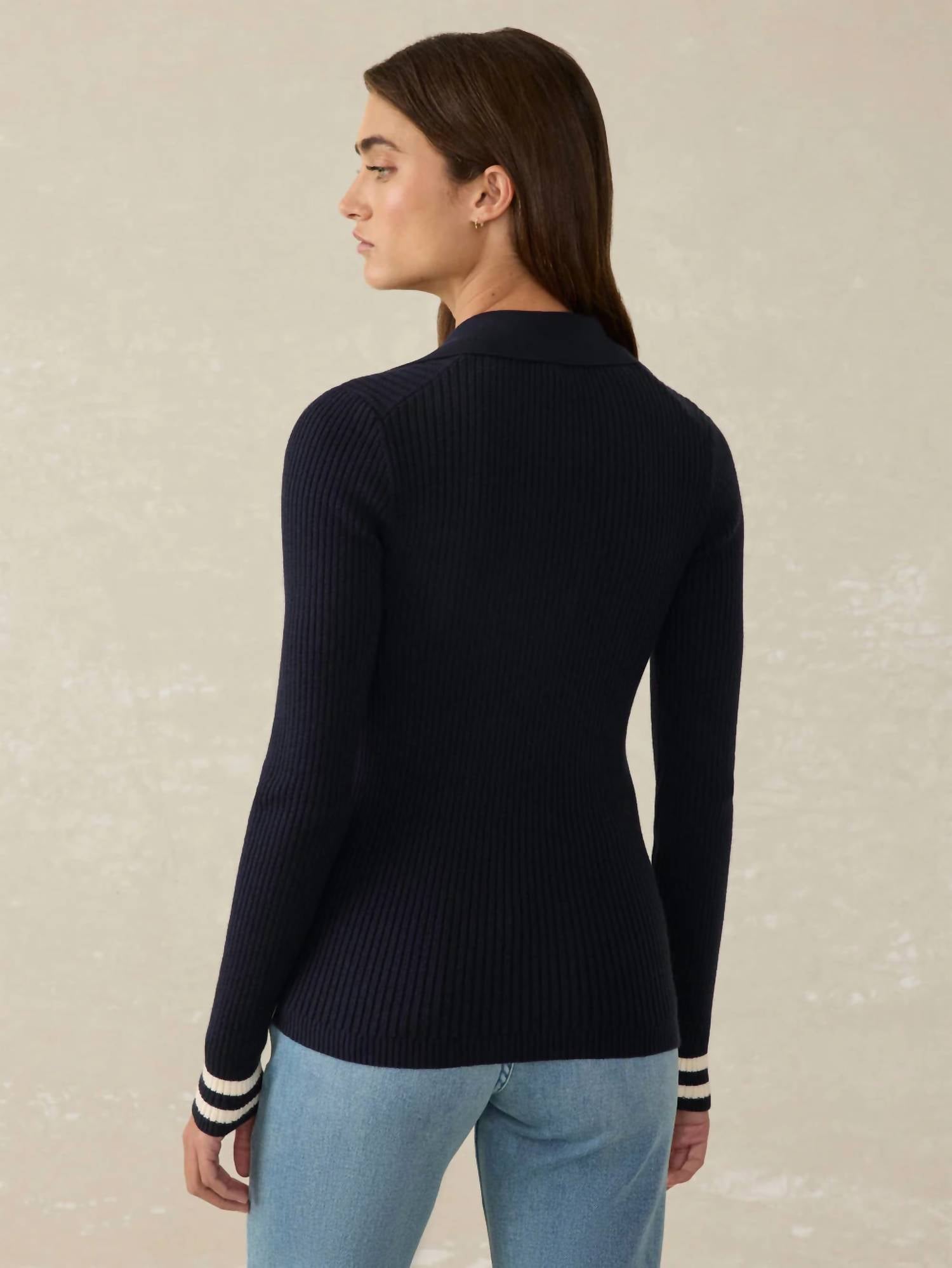 Wear this v-neck sweater with your favorite denim for the perfect fall look. Elevate your holiday party look with the Stretch Cotton Cashmere Rib Polo Pullover by Faherty in a chic Navy Retro Stripe. Featuring long sleeves and rib trims at the V-neckline, sleeve cuffs, and bottom hem, this pullover combines elegance with comfort. Crafted from a luxurious blend of 95% Organic Cotton and 5% Traceable Cashmere, it boasts a fitted silhouette with a garment length of 23 inches. Closure: Pull-on. Care: Hand wash cold with like colors, lay flat to dry, cool iron if needed, and dry cleanable. Model Lexi is 5'7" wearing a size small.