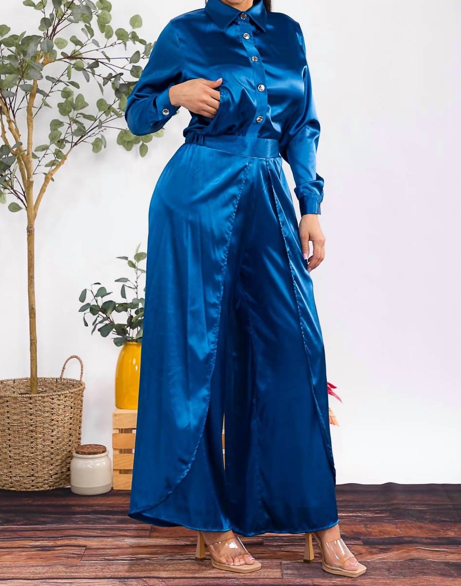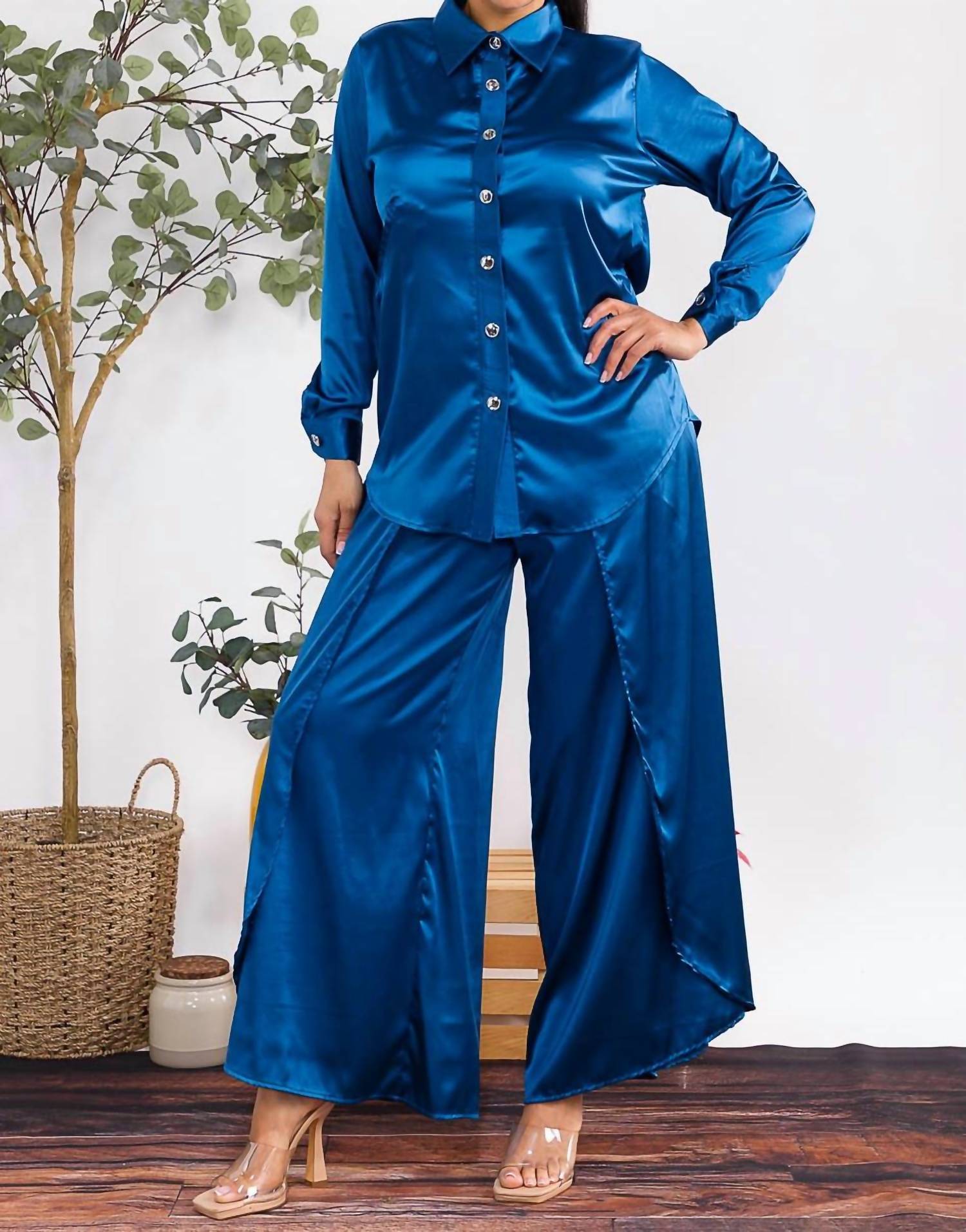 Elevate your loungewear collection with the Karen T Design Button Down Shirt and Open Pants Set in sophisticated purple. This minimalist set features a collar neck with a button-down shirt and long sleeves, perfectly paired with wide-leg open pants with an elastic waist for ultimate comfort. Available in sizes S to 3X, it caters to a range of body types, including plus sizes, and is an excellent choice for a holiday party or a relaxed Mother’s Day celebration. Care: Hand wash. Model is wearing a size medium.