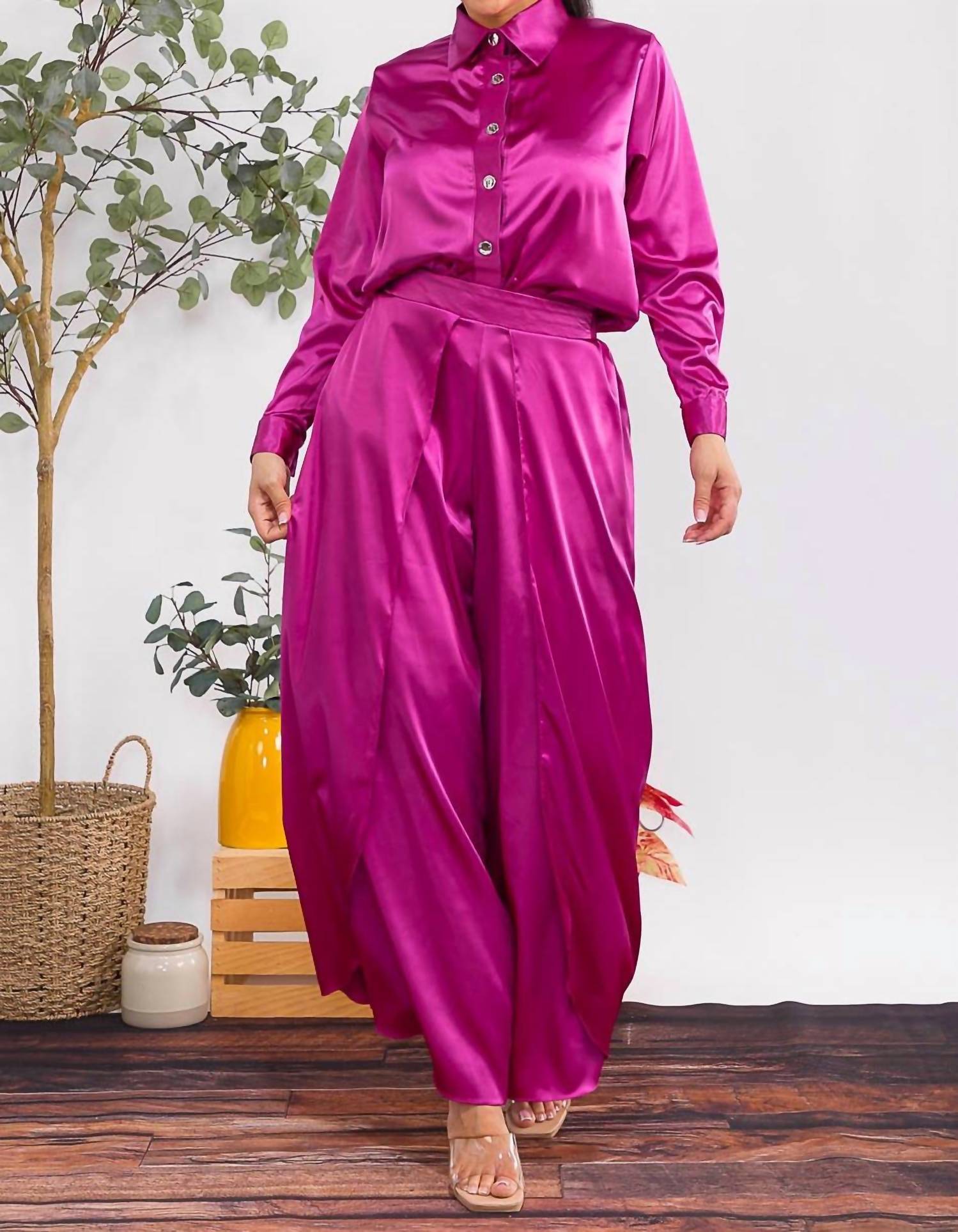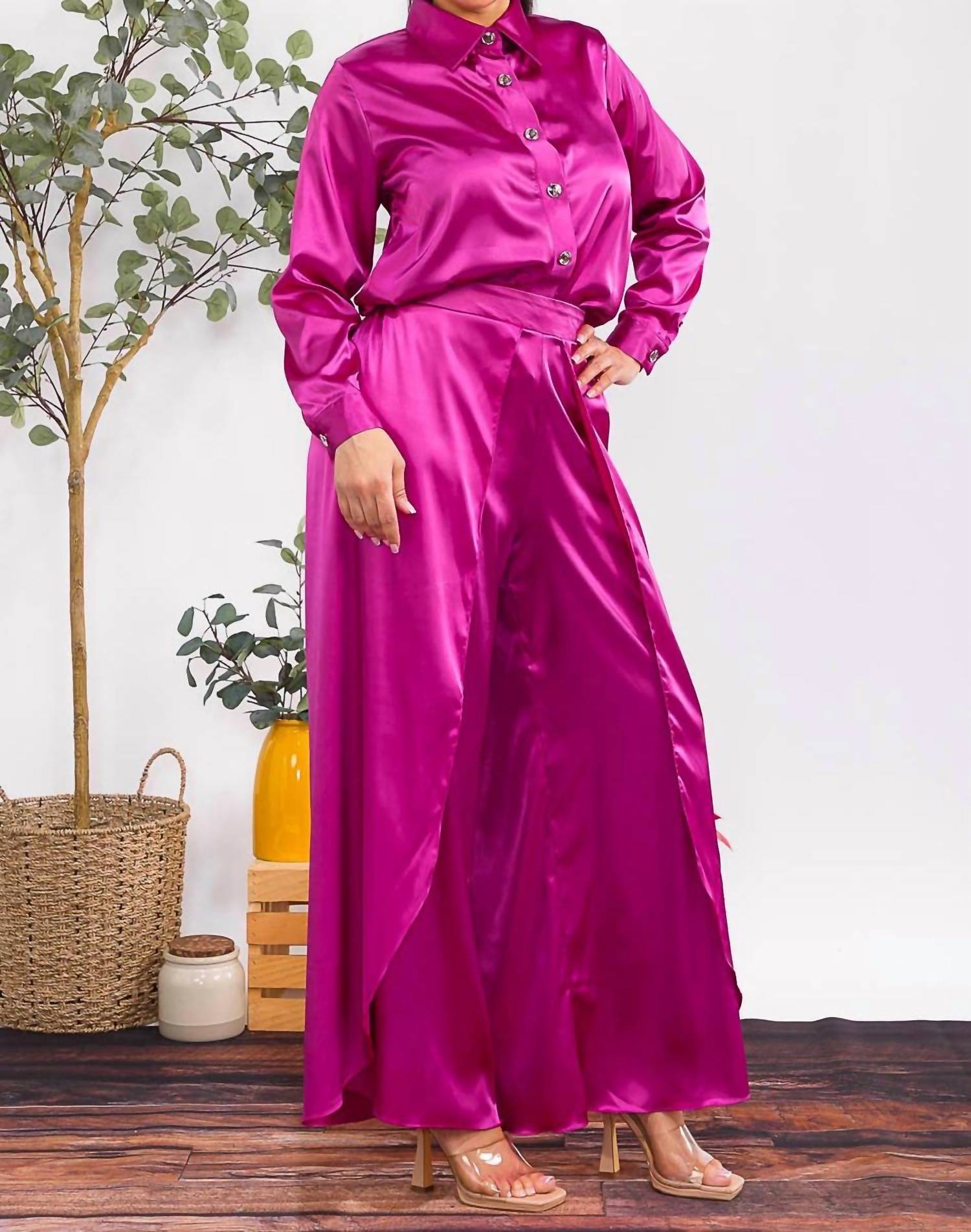 Loungewear doesn't have to be frumpy and this is exactly what we had in mind. Designed for a comfortable fit, this chic little number will be your favorite lounging-at-home look. Elevate your loungewear collection with the Karen T Design Button Down Shirt and Open Pants Set in sophisticated purple. This minimalist set features a collar neck with a button-down shirt and long sleeves, perfectly paired with wide-leg open pants with an elastic waist for ultimate comfort. Available in sizes S to 3X, it caters to a range of body types, including plus sizes, and is an excellent choice for a holiday party or a relaxed Mother’s Day celebration. Care: Hand wash. Model is wearing a size medium.