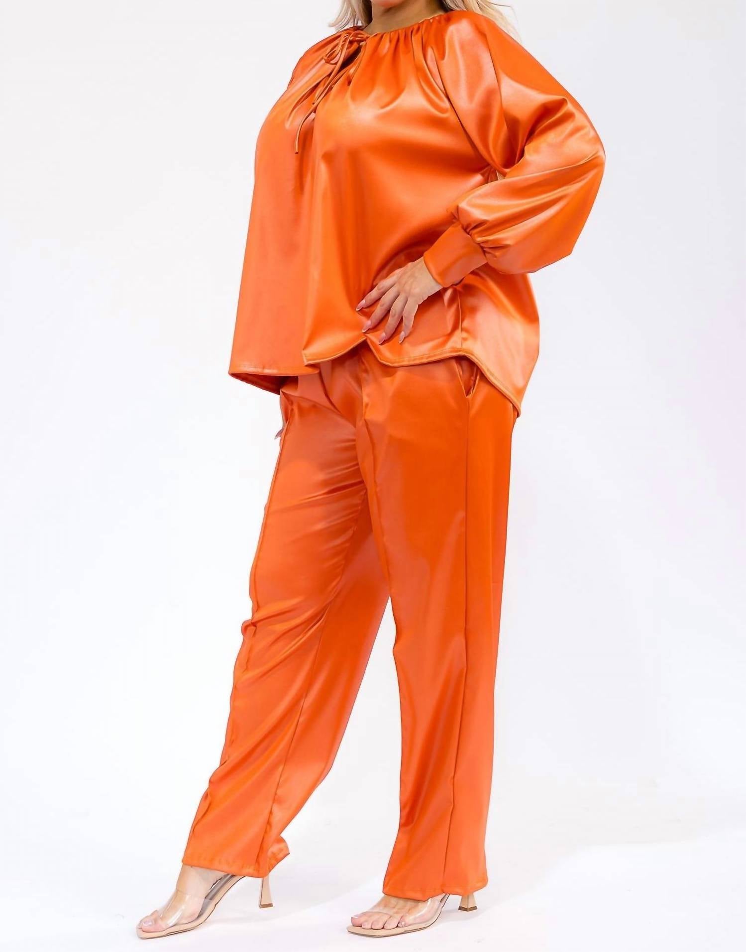 Designed for a chic travel look. Two-piece set in metallic grey features a relaxed oversized shirt with long voluminous sleeves, a gathered crewneck, and a sophisticated tie closure. Coordinating pants offer an elastic waist for comfort and a slight sheen for style. Created from solid polyurethane fabric. Hand wash. Ideal for the minimalist traveler embracing fall fashion.