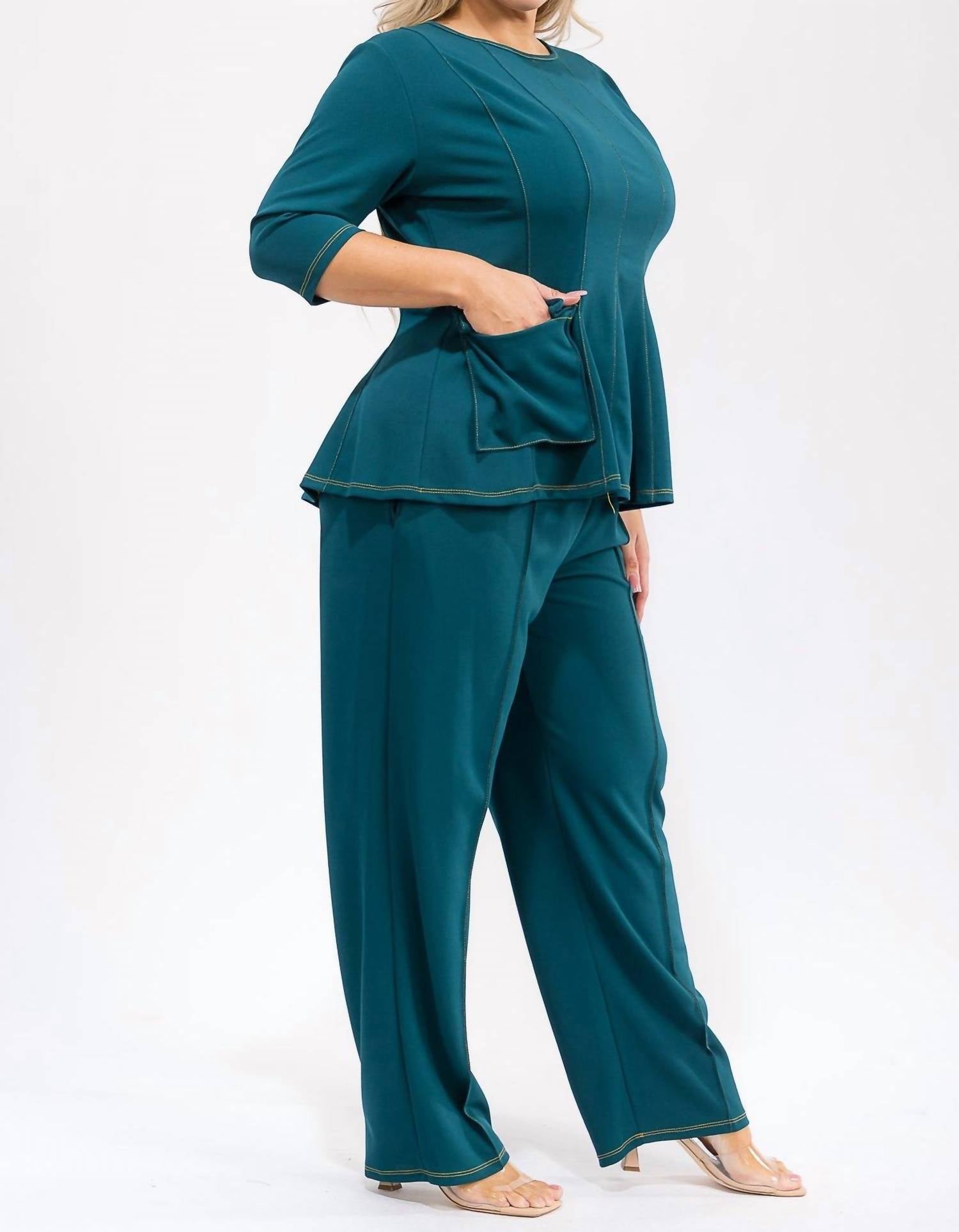 Loungewear doesn't have to be frumpy and this is exactly what we had in mind. Designed for a comfortable fit, this chic little number will be your favorite lounging-at-home look. Discover the Peplum Top And Pants Set by Karen T Design, a chic summer ensemble perfect for holiday parties. This women's loungewear set features a 3/4 sleeve peplum top with a back keyhole and a crewneck, paired with straight cargo pants that boast convenient pockets. Crafted in a solid teal, the pants offer a regular fit with a mid-rise and wide leg style. Care for your new monochrome favorite is easy with machine wash and line dry instructions.
