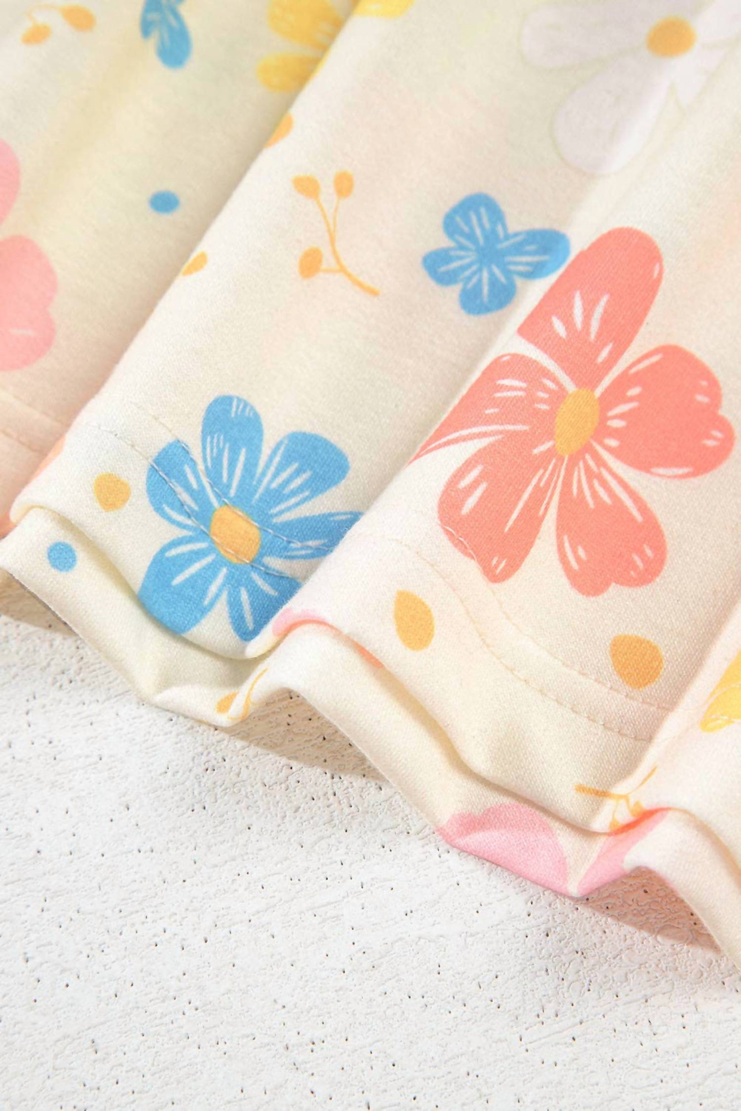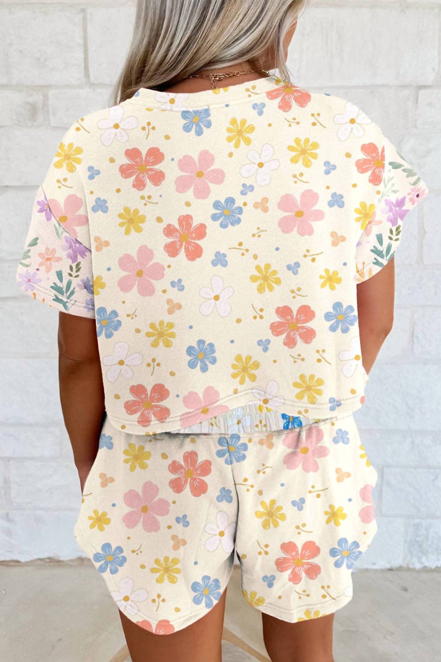 A set so cute you'll never want to take it off. Designed to look good while lounging, this little number is the perfect outfit for hanging at home in style. Discover the Floral Print Crop Top Wide Leg Short Set by Lovesoft, a must-have for summer lounging. This loungewear set features a chic floral pattern in an apricot hue, complete with short sleeves and a crewneck for a flattering fit. Crafted entirely from polyester, this versatile set offers a trendy touch to any vacation wardrobe. Easy to care for, simply machine wash and tumble dry.