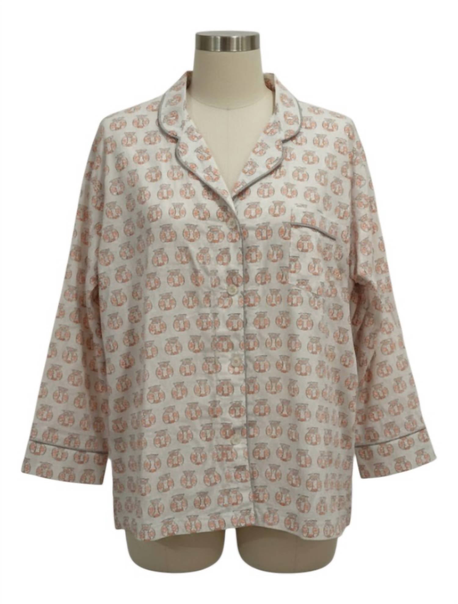 Loungewear doesn't have to be frumpy and this is exactly what we had in mind. Designed for a comfortable fit, this chic little number will be your favorite lounging-at-home look. Introducing the Women's Lorient Short Pajama Set by Marigot, a delightful addition to your summer wardrobe. This coral owls patterned set features a short-sleeve top with a collar and an adjustable drawstring short. Made from 100% cotton poplin, it boasts French seams, a chest pocket, and chic contrast piping. Care is easy with machine wash and line dry instructions, making it perfect for vacation lounging.