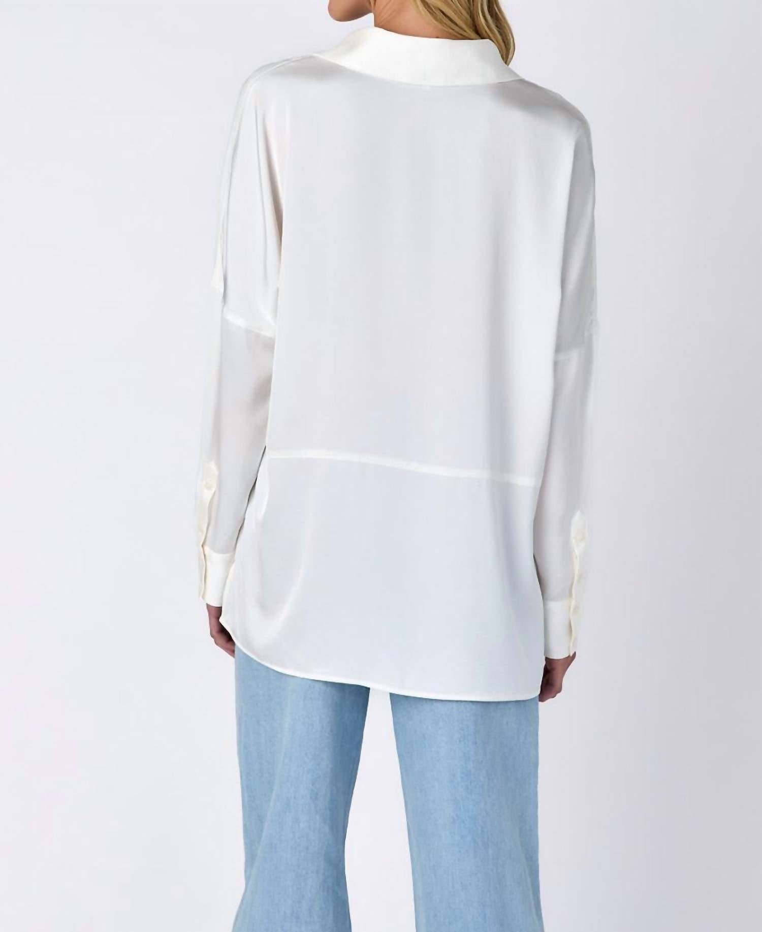 A timeless blouse that will never go out of style. Introducing the Women's Moira Top by Crosby by Mollie Burch, a stunning Henley-style blouse that combines elegance and style. This long sleeve top is crafted from a luxurious satin crepe fabric, offering a beautiful drape with its minimalist design in solid Magnolia White. Closure: Button closure. Perfect for vacation wardrobes, this versatile piece is a must-have for any occasion.