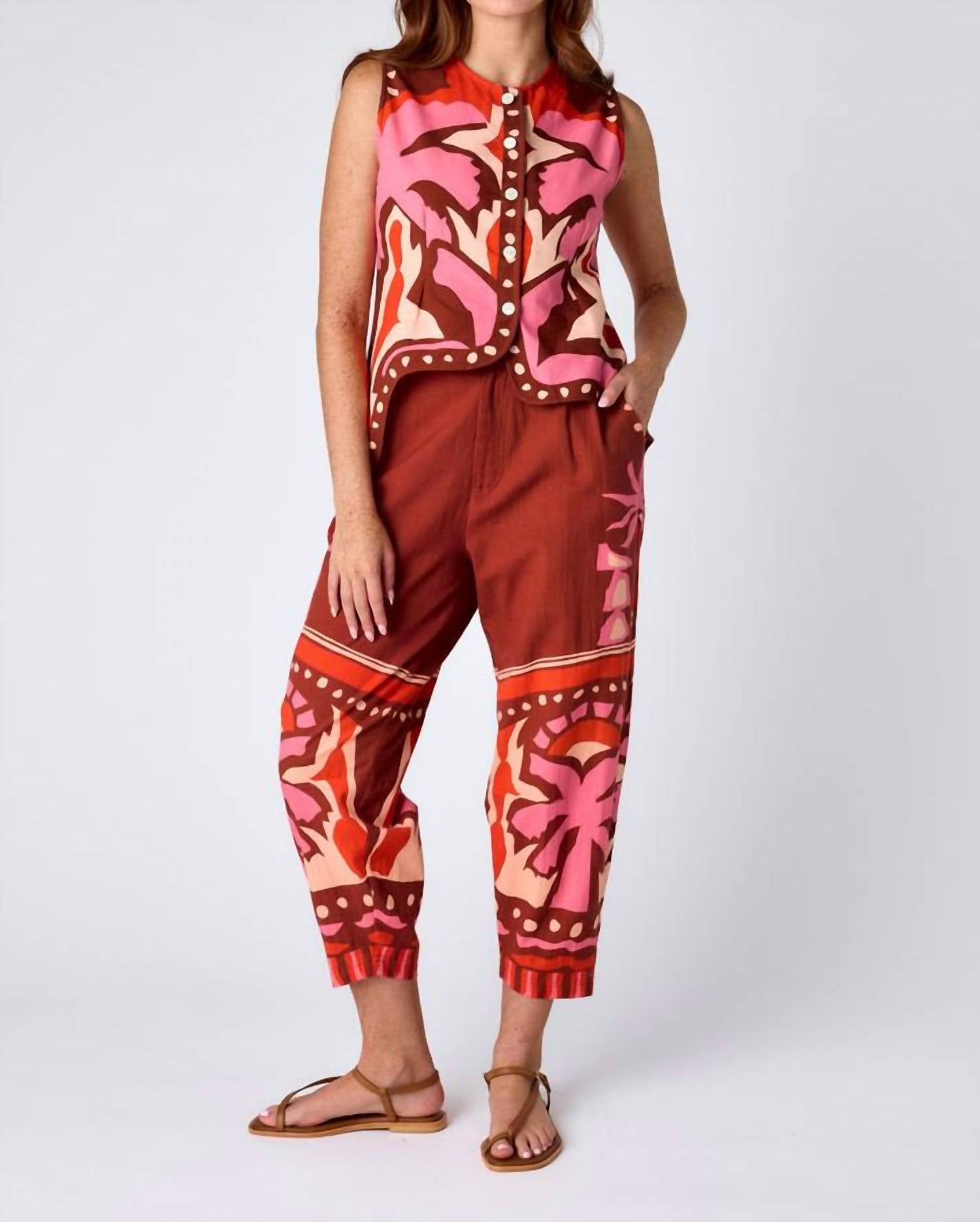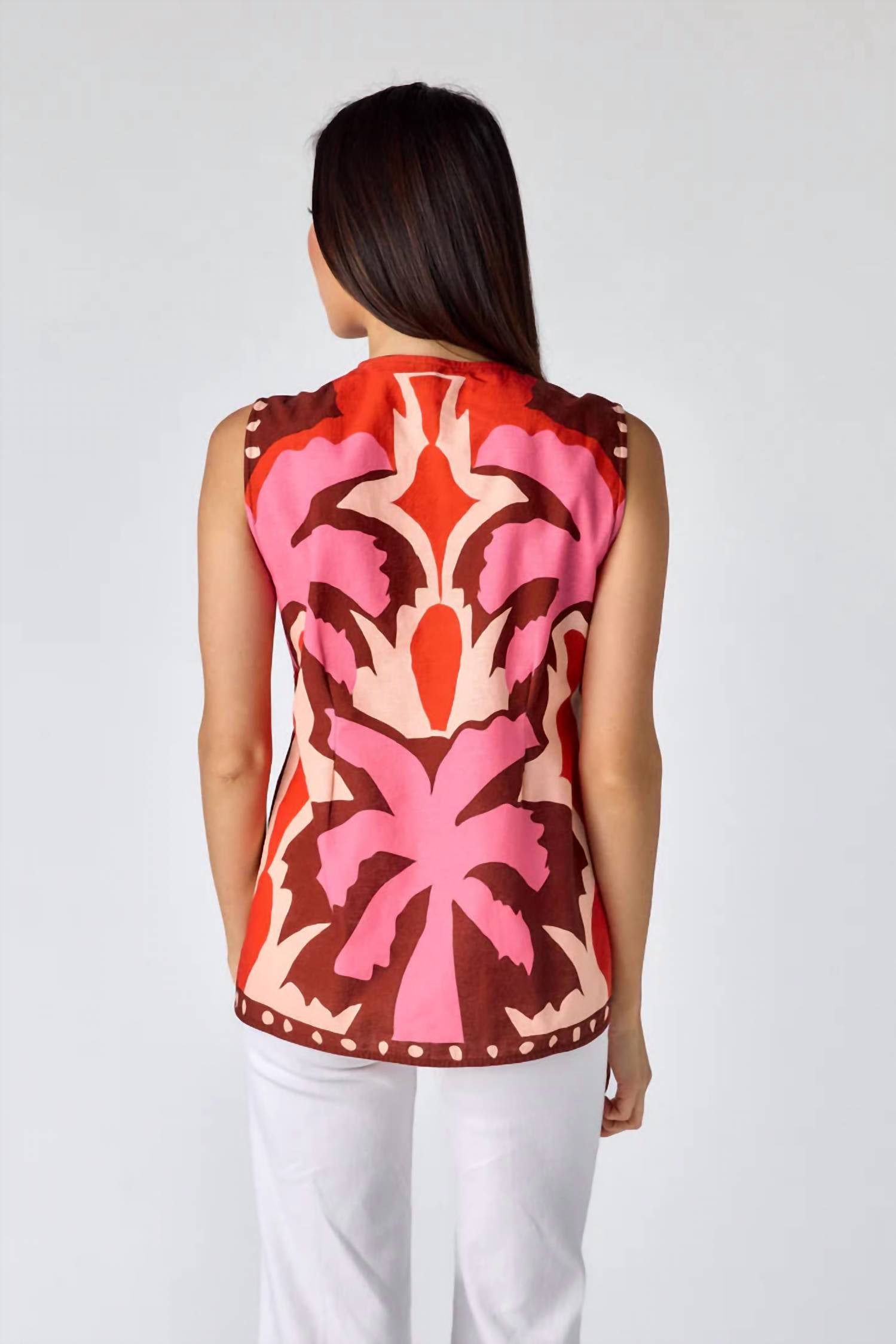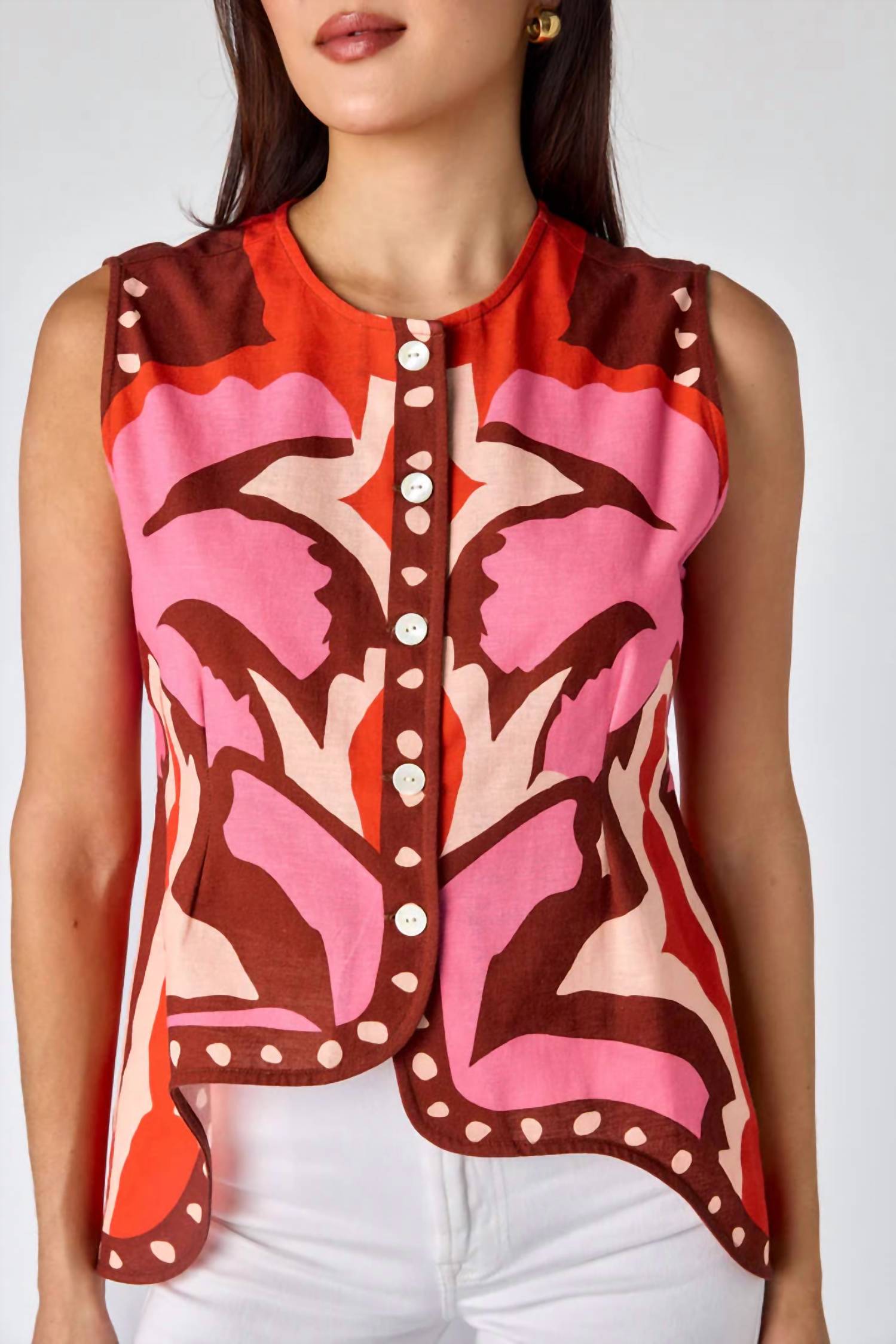 Throw this vest over an all black outfit for a perfectly polished look. Introducing the Axel Vest by Crosby by Mollie Burch, a sophisticated summer staple in a vibrant Mexico City hue. This sleeveless, hip-length top features a chic asymmetrical high-low hem, perfect for making a statement at any holiday party. Crafted from a lightweight and breathable cotton/linen blend, it flaunts a smooth drape and crosshatch weave. Designed with a button closure, it fits true to size with a center front length of 19.75" for a size small. Care is simple with machine washing on delicate and line drying recommended. Model is 5'8" and wears a size small.