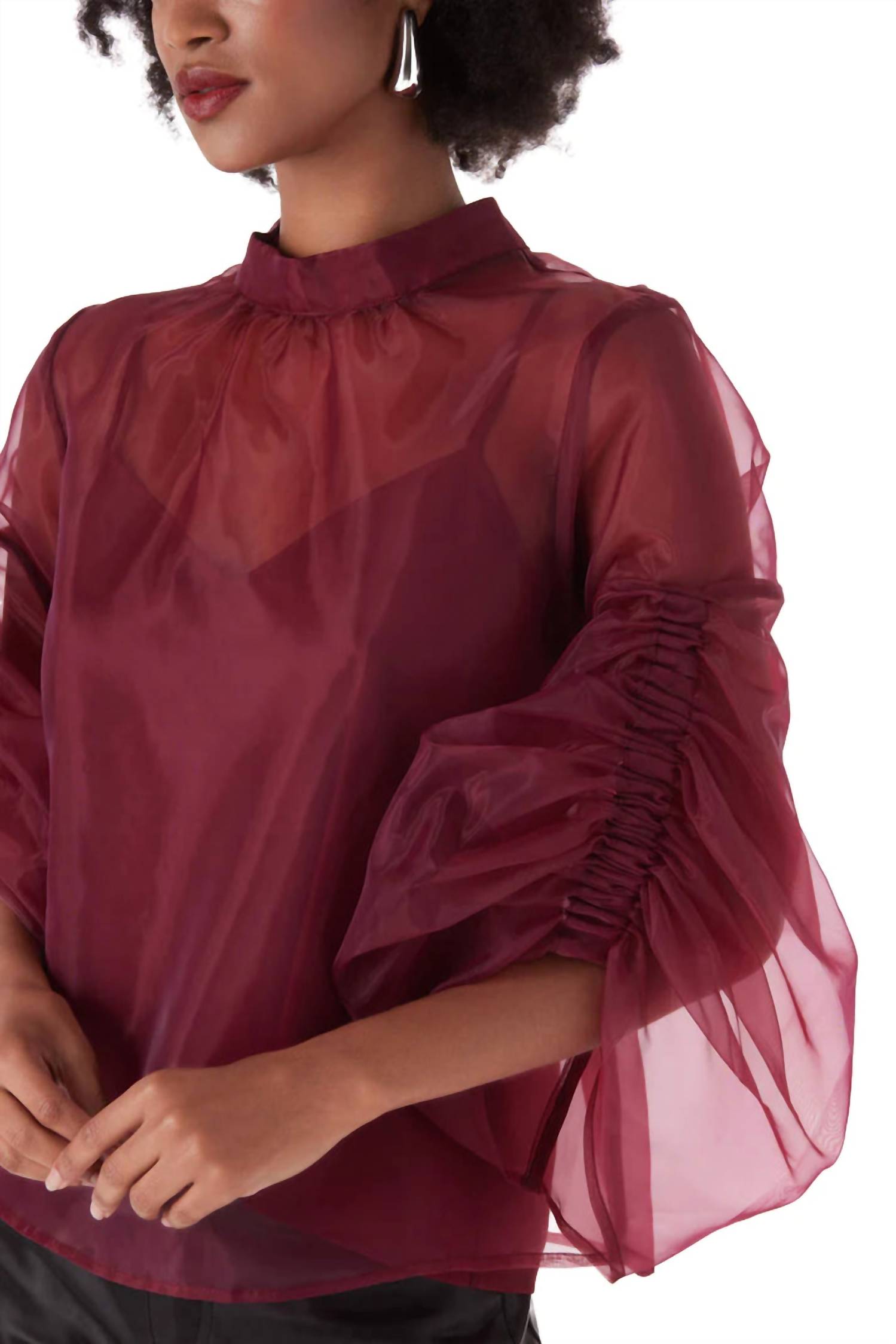An elevated version of your favorite classic blazer. This blouse features a chic mock-neck with a button closure and keyhole back. It has voluminous 3/4-length sleeves with ruched elastic details, made from sheer organza with a lustrous sheen. Care: machine wash cold. Straight fit, with a length of 24.5" (size small). Model is 5'10" and wears a small.
