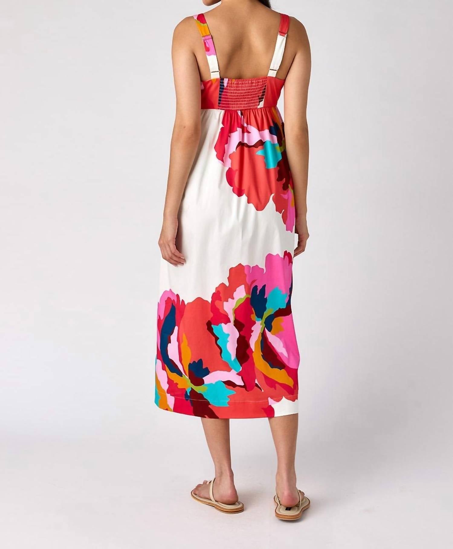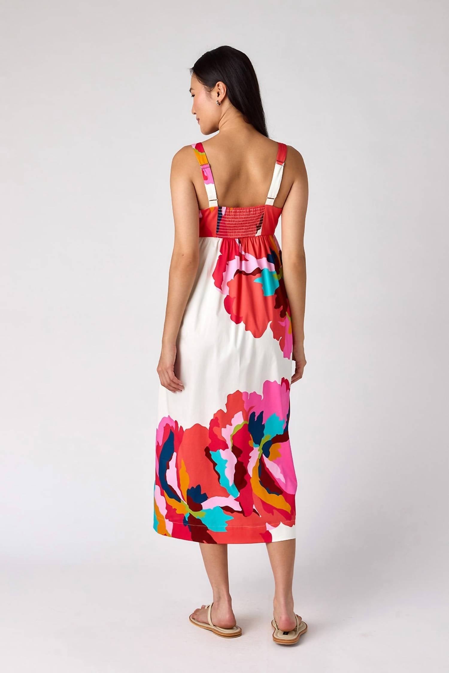 A midi dress so versatile, your options for wearing it are endless. The Callie Dress has a fitted empire waist and a flowing A-line skirt that falls to calf length. It is fully lined, includes pockets, and features bra-friendly straps with a hidden loop and snap for extra security. Made from lightweight, breathable cotton, it is suitable for warm weather. The dress measures 51 1/4 inches in length for size small. Care instructions: machine wash cold on delicate or normal cycle, avoid hot water, lay flat or hang to dry, and use medium iron or steam to remove wrinkles.