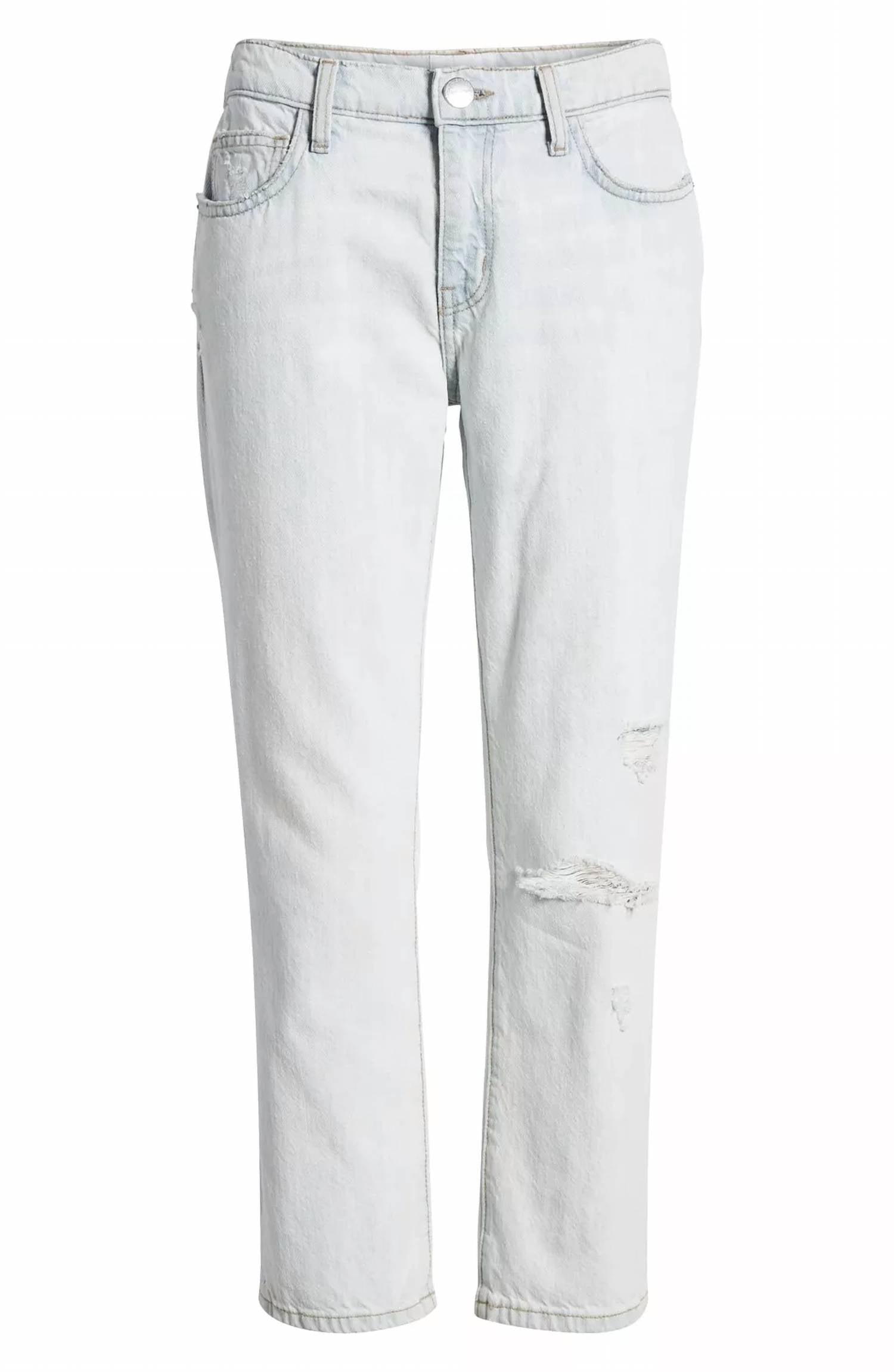 Introducing the Cropped Straight Leg Destroy Ankle Jean by CURRENT/ELLIOTT, offering a chic blend of comfort and style. These jeans exhibit a lived-in look with rips at the knee and an intensely faded wash, perfect for a no-fuss aesthetic. Composition: 81% cotton and 19% lyocell, crafted in blue denim. Made in the USA with an inseam of 26", front rise of 10", back rise of 15", leg opening at the hip 11.5", and a waist of 17.5". Closure: Zip fly with button. Style: Five-pocket. Care: Machine wash, tumble dry.