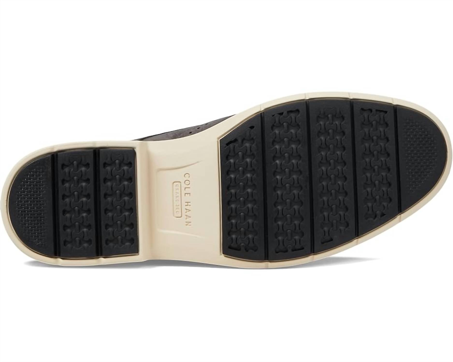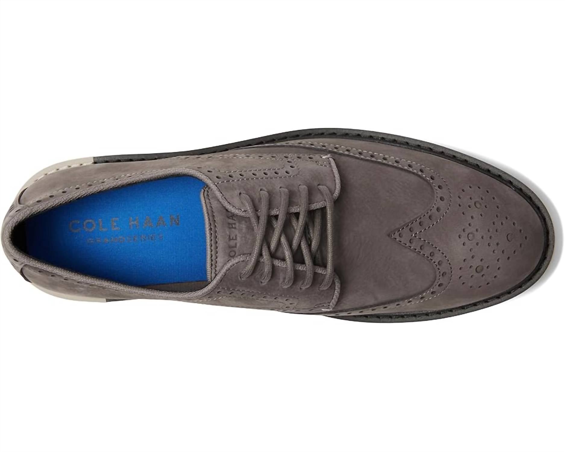 Introducing the Men's Go-to Wing Oxford Shoes by COLE HAAN in a sophisticated Tornado Nubuck, perfect for both the office and special evening events. These oxfords feature a classic almond toe and flat heel, crafted from premium nubuck uppers for a dapper silhouette. Enjoy all-day comfort with the luxuriously cushioned GRANDFØAM footbed and a reliable EVA outsole with rubber pods for exceptional traction. Ideal for spring workwear, these shoes combine style and function effortlessly.