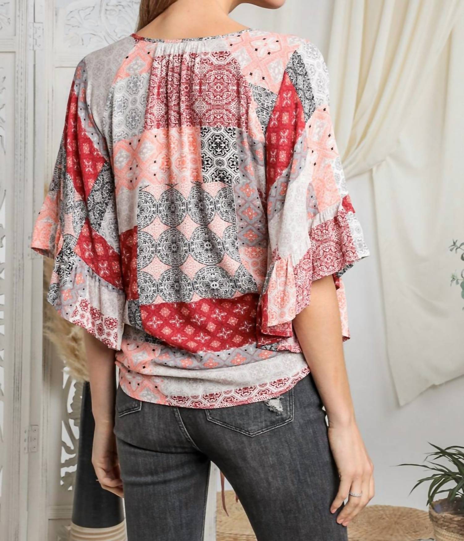 A timeless blouse that will never go out of style. Elevate your summer wardrobe with the Contrast Boho Panel Draped Tie-Front Blouse by DAVI & DANI. This women's blouse comes in a feminine pink hue, featuring elbow-length sleeves and a chic scoop neckline that exudes elegance. Made from a combination of rayon, polyester, cotton, and spandex, it ensures comfort and free movement with its stylish tie-front and vivid contrast panels. Perfect for church or any summer occasion, this pattern-rich piece is a must-have for any fashion-forward collection.