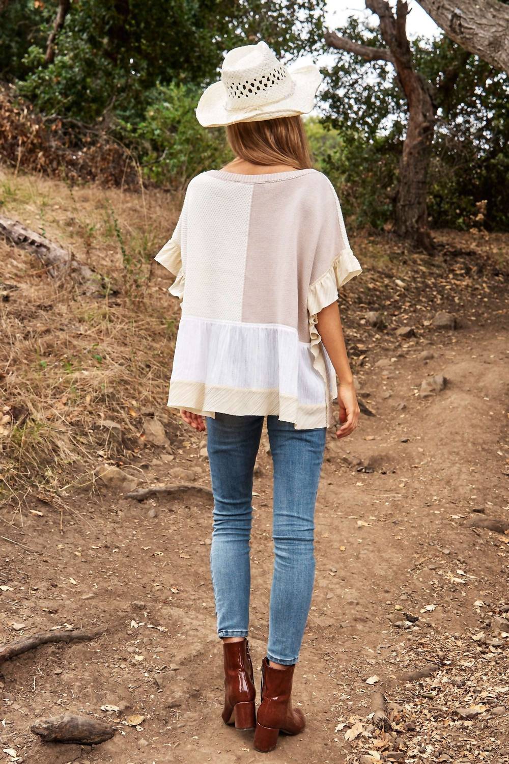 The short sleeve tee you'll want in every color. Step into effortless style with the Mix Match Textured Ruffle Detail Sweater Top by DAVI & DANI. This women's short sleeve top in white features a playful ruffle detail and a boho chic patterned design, perfect for a baby shower or Easter celebration. Crafted from 100% polyester, this pull-on style ensures both comfort and ease. Embrace a summer-ready look with its crewneck silhouette, available in plus sizes for a perfect fit. Model is wearing a size small (5'10" height, 34C bust, 25" waist, 35" hips).