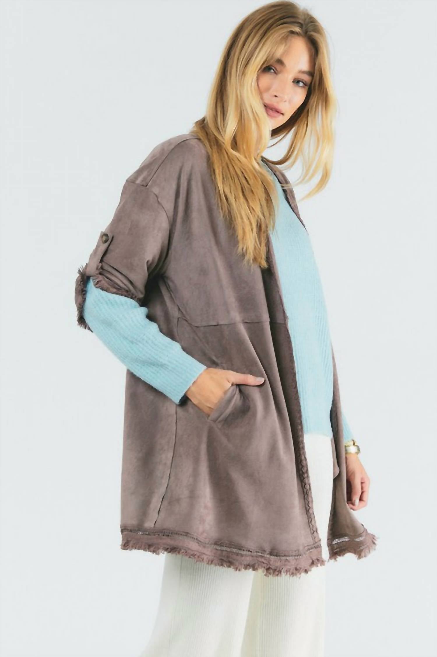 Throw this adorable cardigan over any cami or tank top. Elevate your wardrobe with the Suede Fringed Cardigan by DAVI & DANI, a sophisticated addition for any season. This grey cardigan features three-quarter sleeves and a crewneck, with a charming solid pattern. Crafted from a blend of 90% Polyester and 10% Spandex, this piece is designed for a comfortable and slightly stretchy fit. No closure for relaxed layering and effortless style. Perfect for any occasion, this cardigan also offers the convenience of pockets.