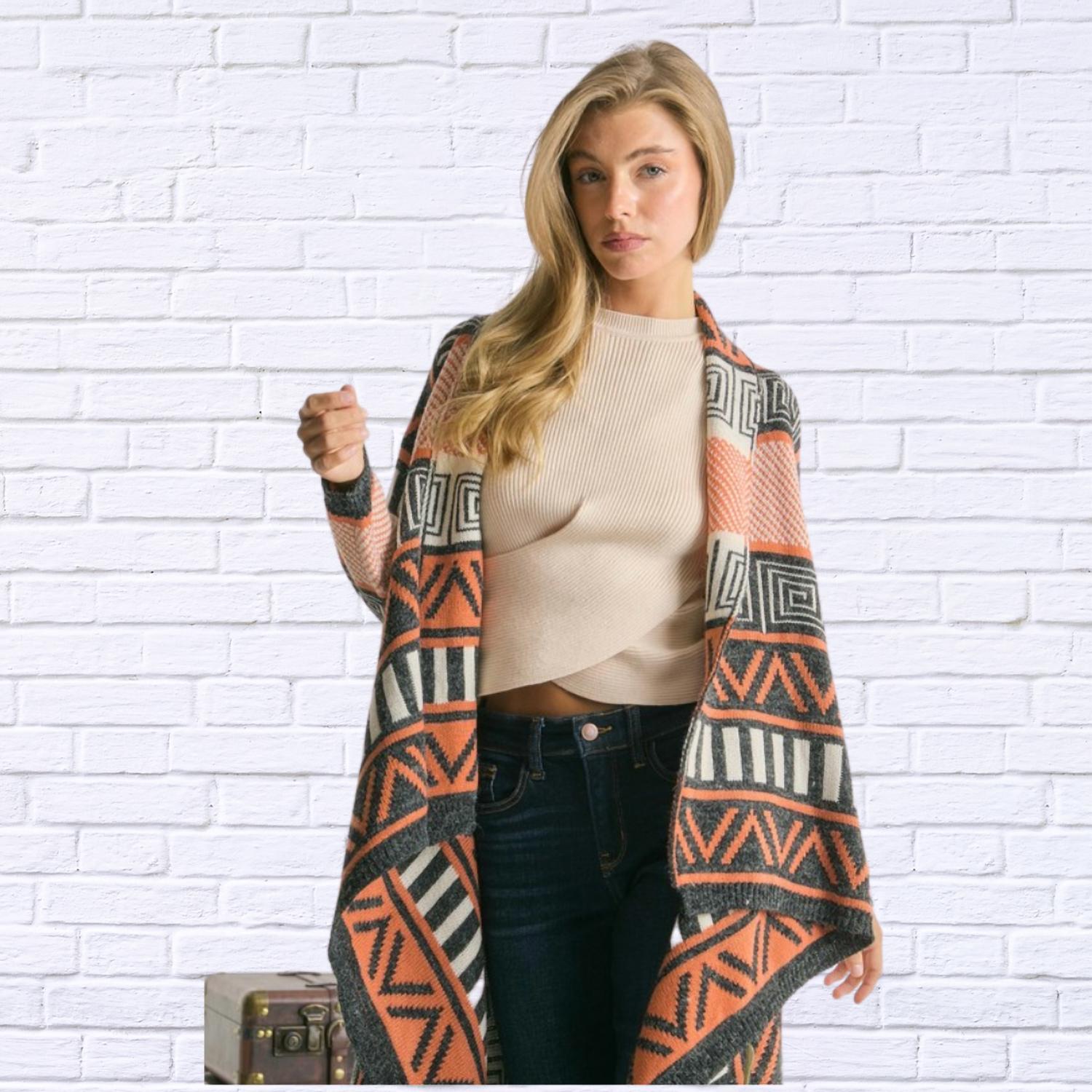 A classic fit that works just as good buttoned as it does left open. Introducing the Printed Shawl Fringed Hem Cardigan by DAVI & DANI, crafted from soft fleece and adorned with a vibrant tribal print in rust and black. This women's cardigan features long sleeves and a stylish fringed hem, perfect for fall layering. Designed for easy wear, it has a pull-on closure and a collar neckline, offering both comfort and convenience. Care for this piece by hand washing it, ensuring it remains a staple in your wardrobe for seasons to come.