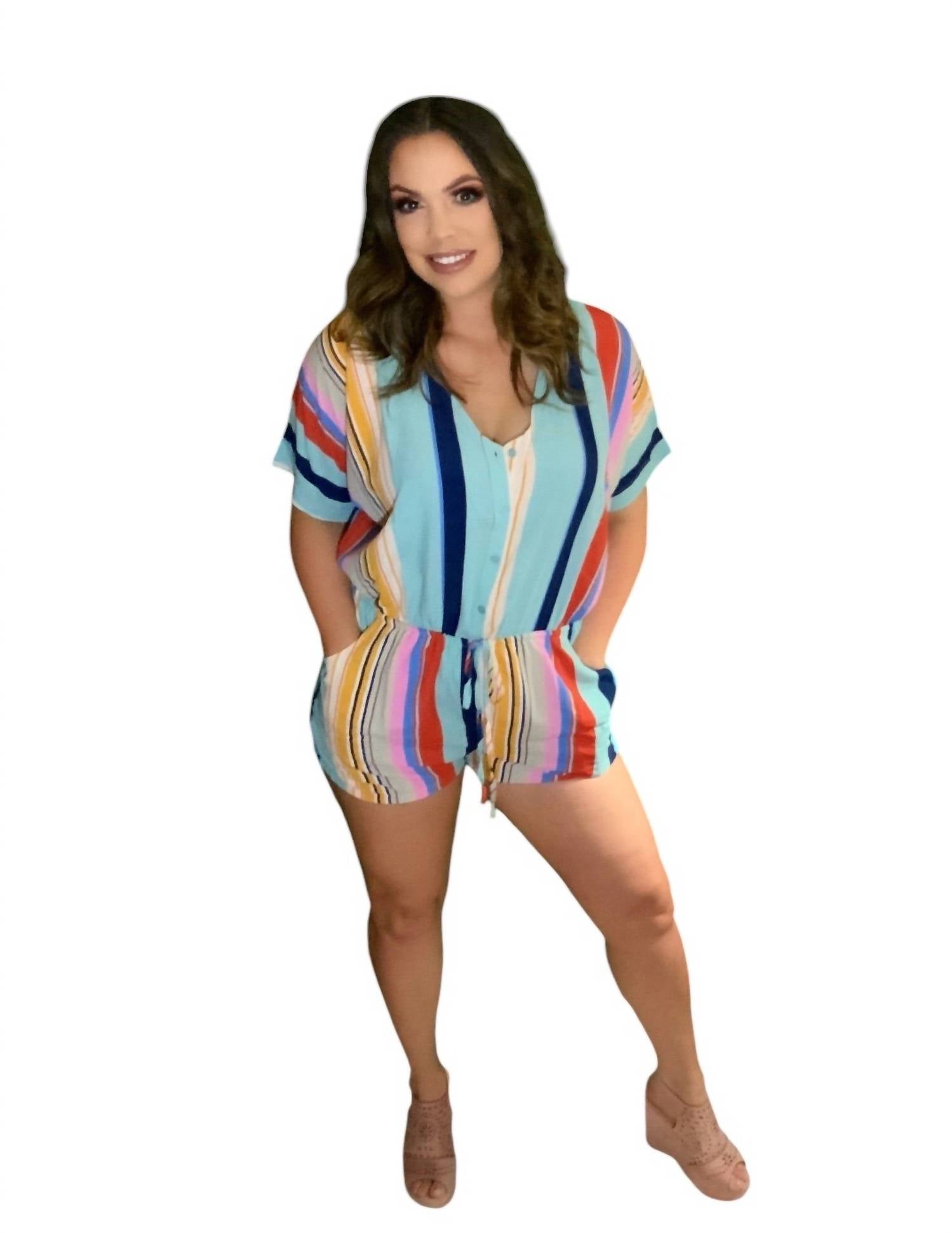 Throw it on and go! Designed with practicality in mind, it features convenient pockets, a waist drawstring, and a secure button closure. This romper is thoughtfully lined in the shorts for added comfort.