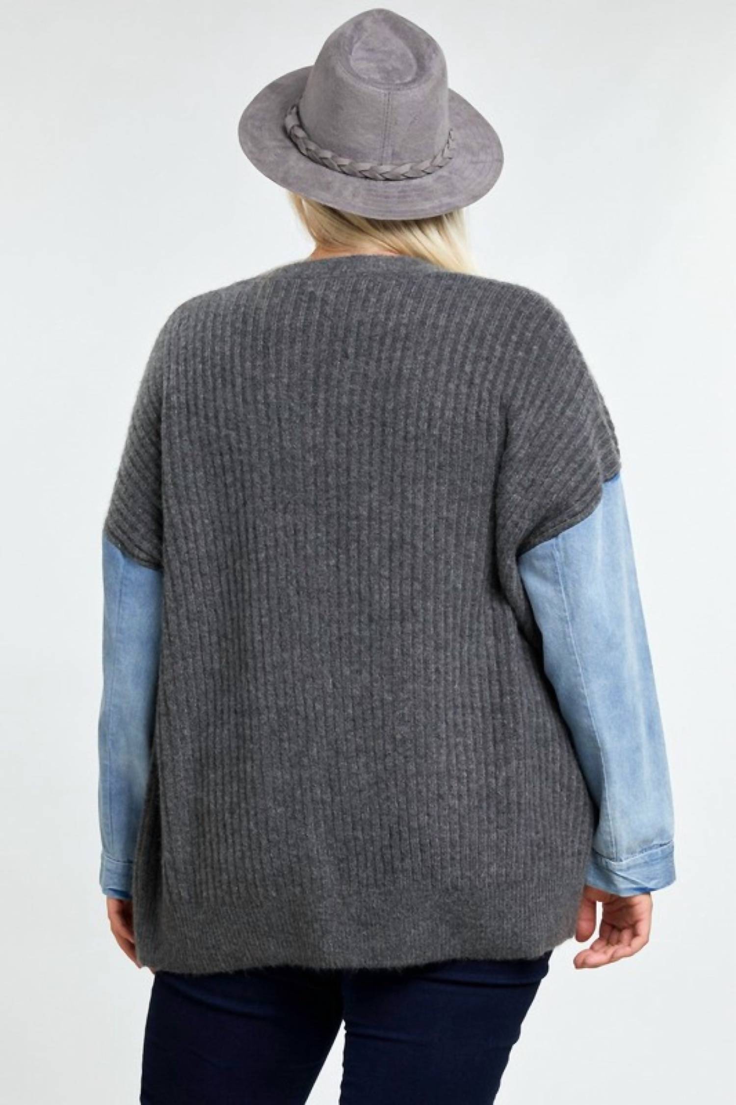 Throw this adorable cardigan over any cami or tank top. Introducing the Davi & Dani Oversize Sweater Cardigan with Denim Sleeve, a casual staple in chic charcoal. This long sleeve cardigan features a striking colorblock pattern and regular fit with a touch of stretch for comfort. Crafted from a luxurious blend of 64% Acrylic, 32% Polyester, and 4% Spandex, this cozy piece has a pull-on style with no closure for easy layering. Care instructions: Machine wash or opt for professional dry cleaning. Available in plus sizes, making it a perfect addition to any wardrobe.