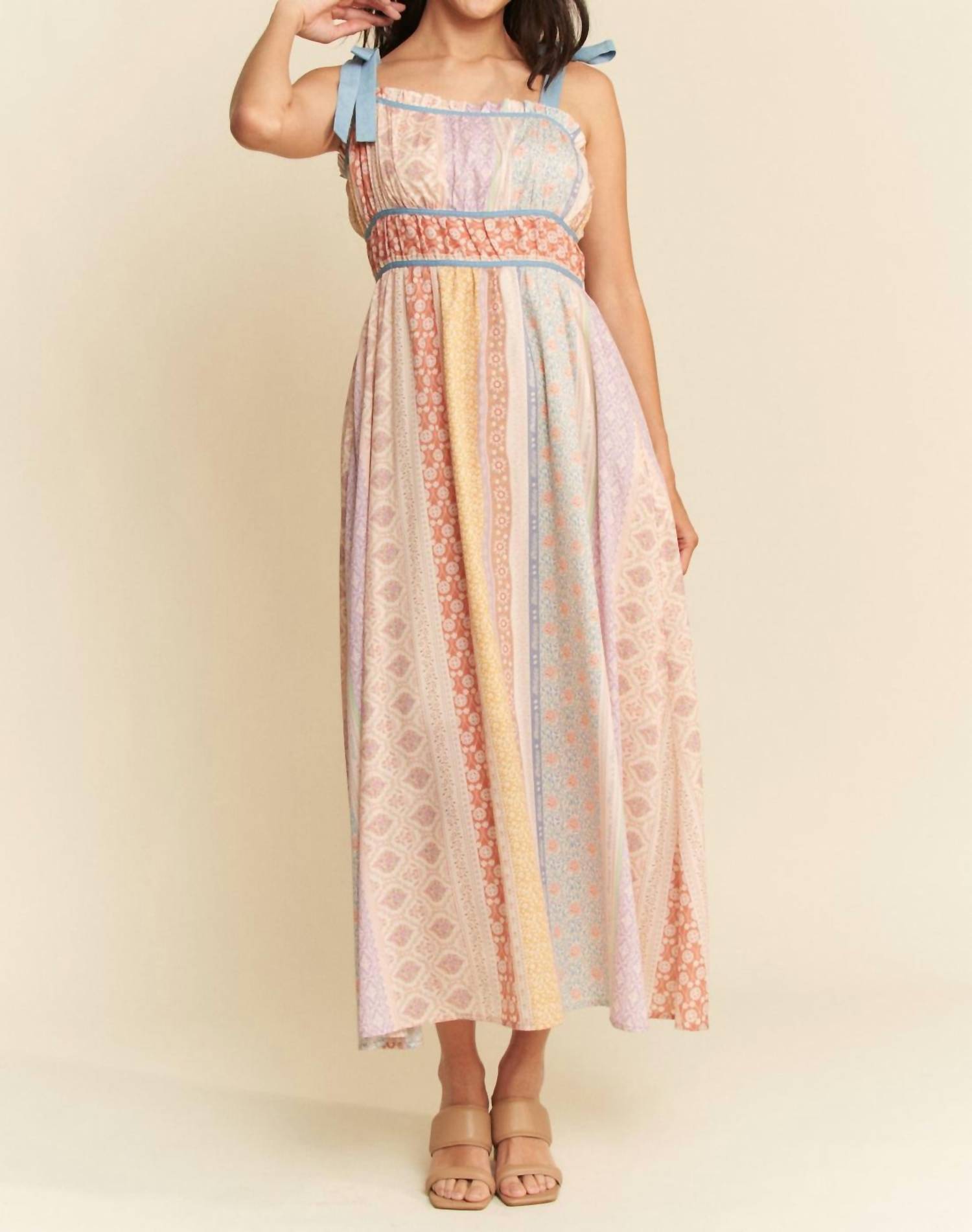 Just add slides or mules and you are good to go. Elevate your vacation wardrobe with the Contrast Ruffle Trim Striped Midi Dress by DAVI & DANI, a must-have for spring occasions like Mother’s Day. This sleeveless dress features a chic squareneck and an empire waist silhouette, ideal for a stylish maximalist look. Crafted from 65% rayon and 35% polyester, this patterned midi dress is designed for comfort and ease with a pull-on closure. Care for your garment by machine washing and tumble drying for long-lasting wear.