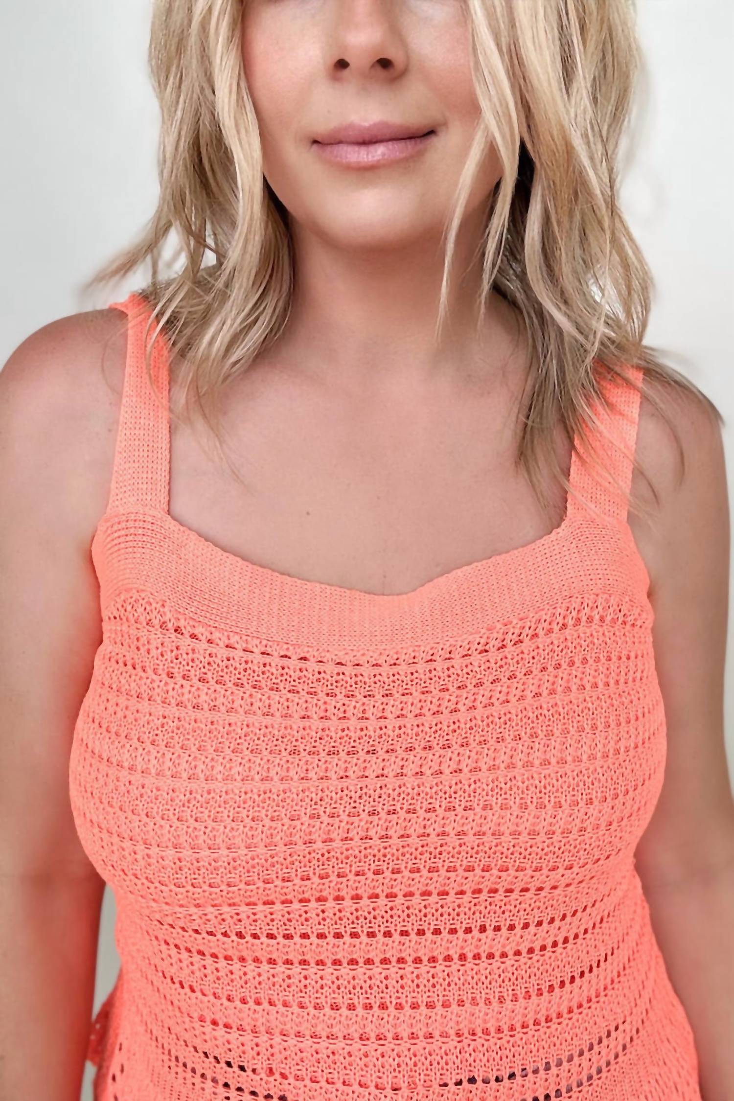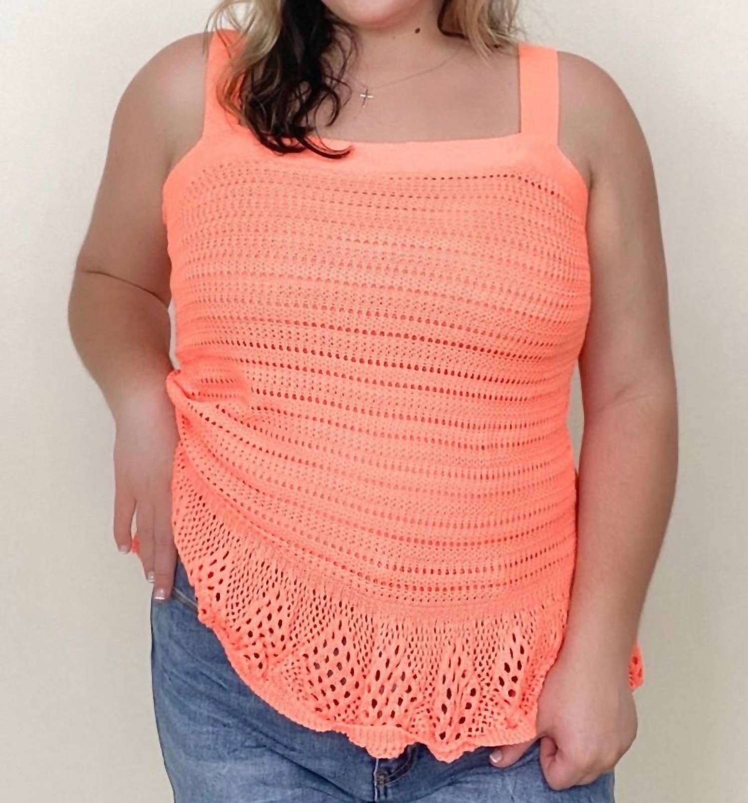A versatile blouse that works from desk to dinner! Embrace vibrant style with the Knit Peplum Tank Top by DAVI & DANI in striking neon orange. This sleeveless top features a square neckline and adjustable straps for a customizable fit, crafted from 100% polyester. Enjoy the comfort of a non-stretch material, tailored to accommodate standard to plus sizes. Easily maintain this stylish piece with machine or hand wash care, but please do not bleach. Model Richelle, size 6, is wearing a size S (5′4″ height, 32.5″ waist, 41″ hips, 37.5″ bust), and Model Reagan, size 14/16, wears a size 1X (5′7″ height, 38″ waist, 48″ hips, 40″ bust).