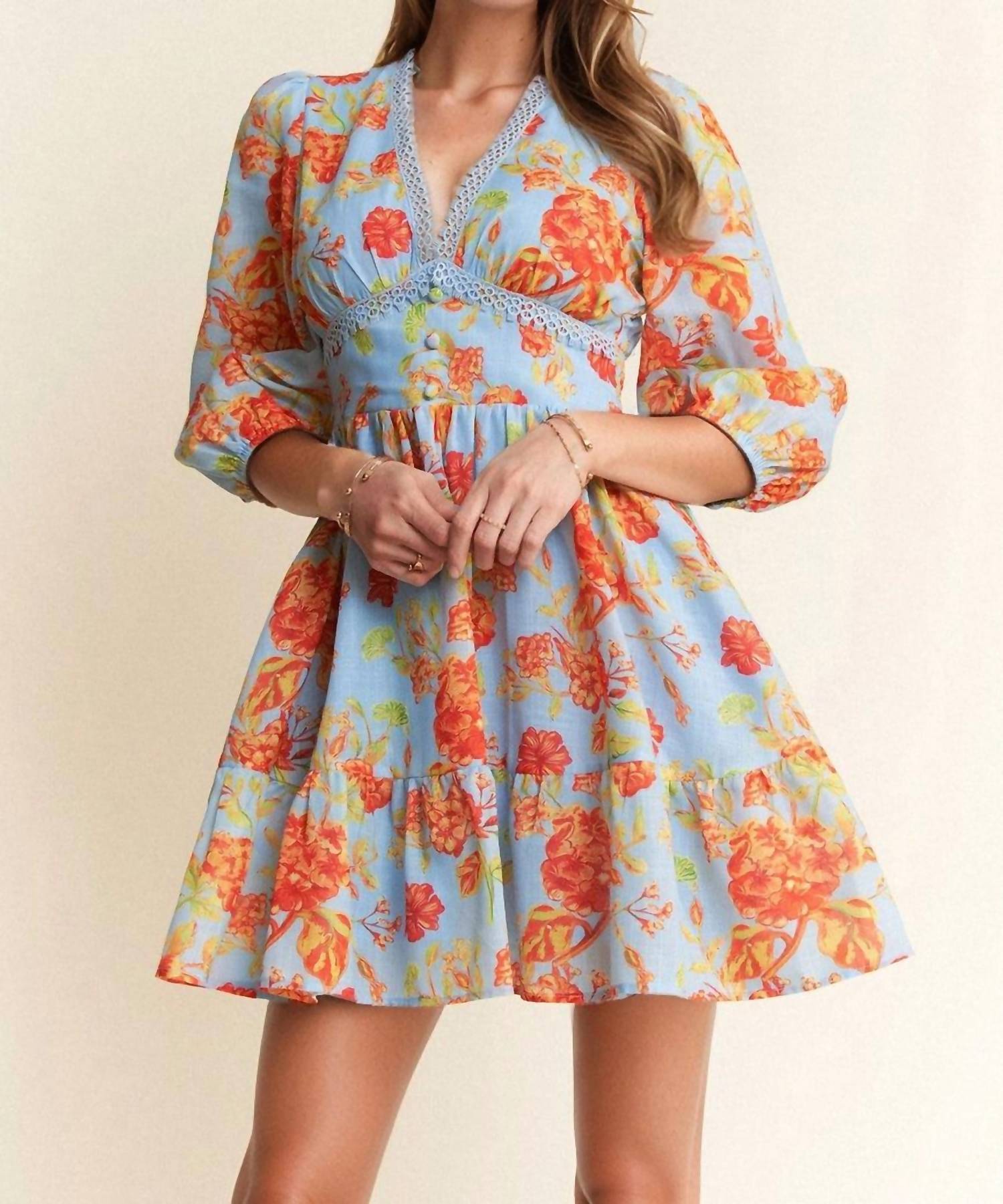 A short and breezy dress for those warmer days. Introducing the Floral Color Block Mini Dress by DAVI & DANI, a perfect choice for your summer wardrobe with its Boho Chic vibe. This fit-and-flare silhouette showcases a vibrant floral pattern complemented by three-quarter sleeves and a flattering V-neck. Expertly designed for vacation-ready simplicity, the dress promises an effortless style in dusty blue. Crafted for ease of care, simply hand wash to maintain its allure.
