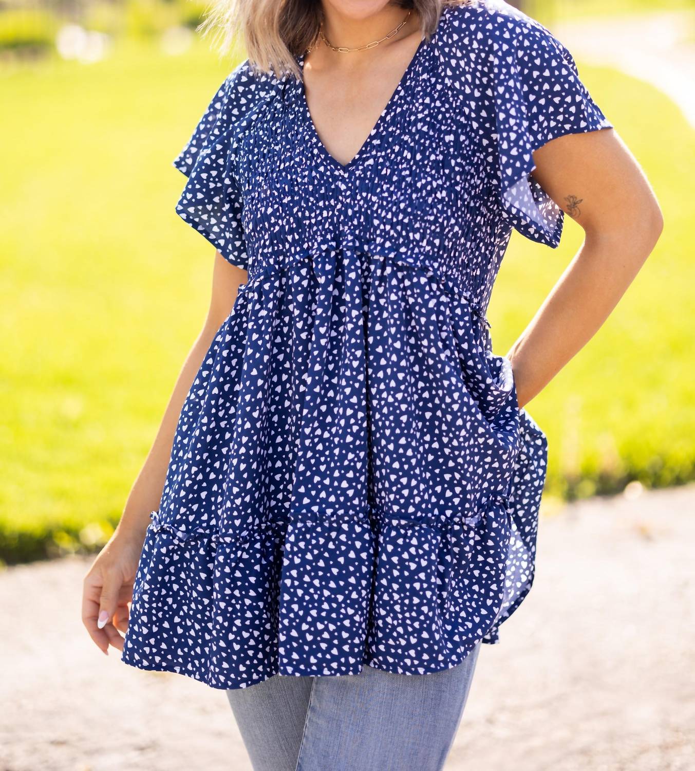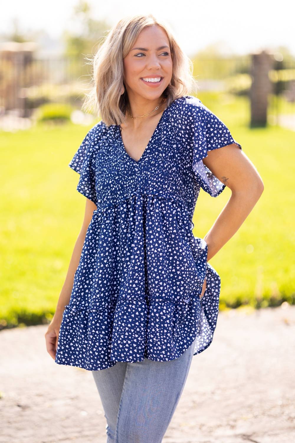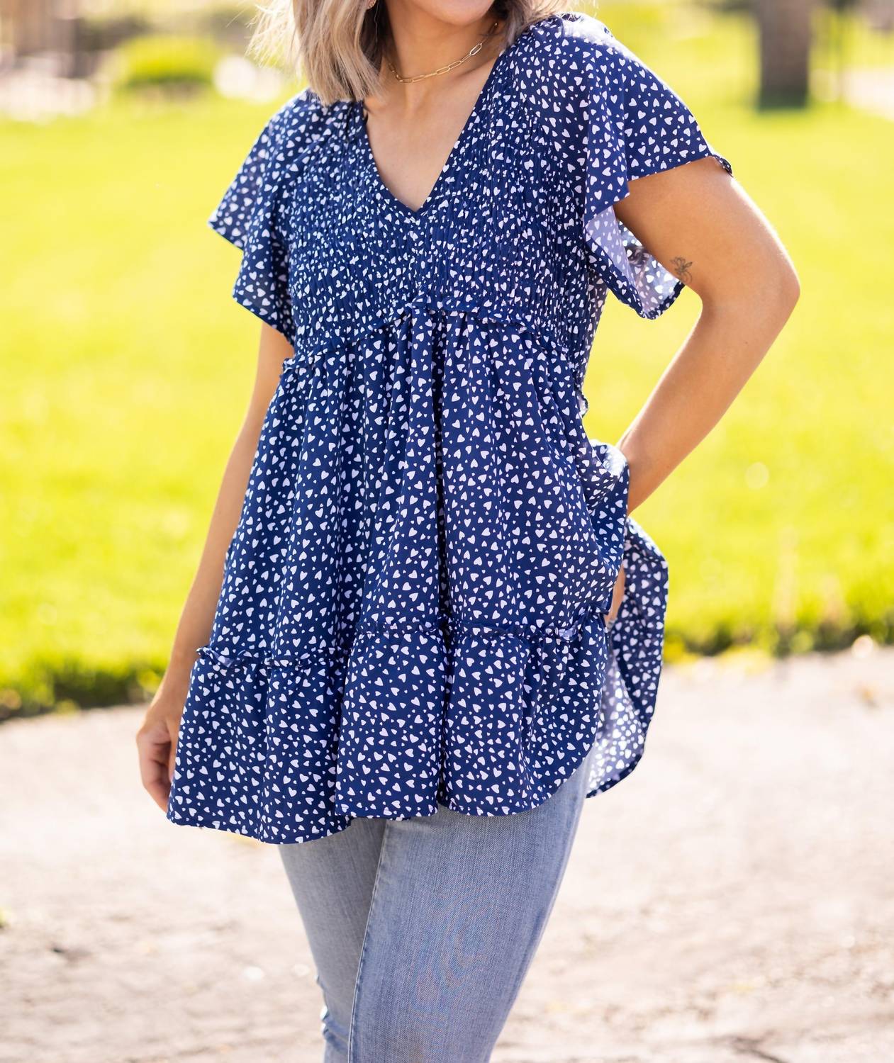 Discover the versatile charm of this tunic blouse, designed with both layering and standalone wear in mind. Its flattering silhouette and stylish details make it a closet essential. Standout piece in vibrant royal blue. Features short sleeves, a playful heart print, a smocked chest, and a tiered ruffle hem, ideal for housewarming occasions. Crafted from 100% polyester. Offers a comfortable, no-stretch fit. Pull-on style. Hand wash. Perfect for adding a dash of 90s fashion to your summer wardrobe.