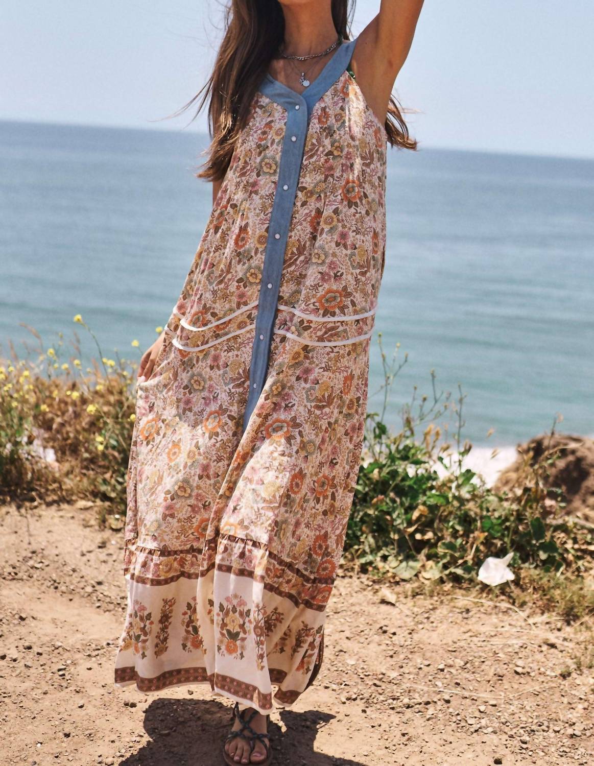 Who doesn't love a good maxi dress? This one you'll be reaching for season after season. Experience effortless elegance with the Floral Maxi Dress by DAVI & DANI, designed in a natural hue with a charming floral pattern. This sleeveless, V-neck dress features an A-line silhouette, offering a flattering fit for plus-size women. Crafted primarily from rayon, it incorporates a blend of cotton and polyester for added comfort. Closure: Button closure. Care: Hand wash only.
