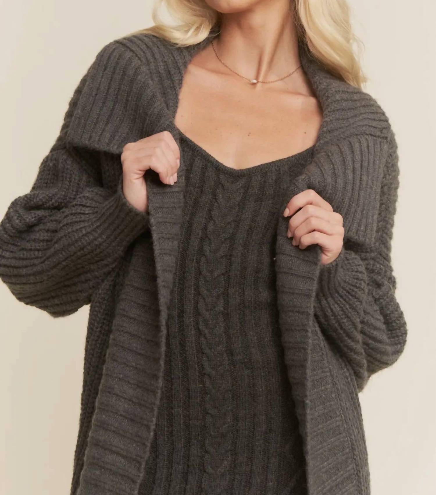 Davi & Dani - Ribbed Texture Cardigan with Matching Sweater Dress
