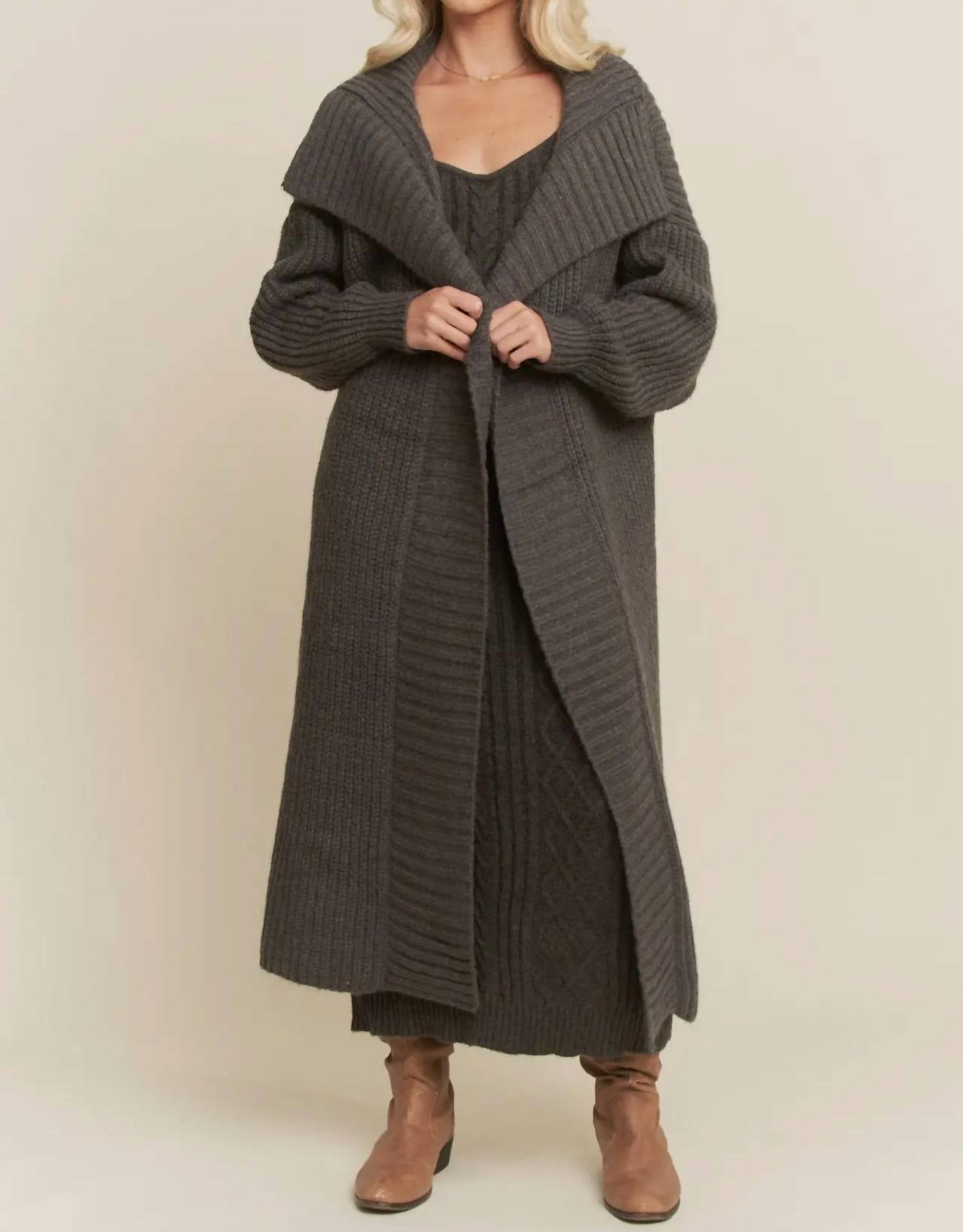 A classic fit that works just as good buttoned as it does left open. The Ribbed Texture Cardigan with Matching Sweater Dress by DAVI & DANI is a minimalist must-have for your fall wardrobe. Featuring long sleeves and an open front cardigan, this outfit boasts a textured, oversized fit in chic gray. Closure: Pull on. Care: Machine wash. Perfect for Thanksgiving dinner parties, this elegant ensemble offers cozy sophistication.