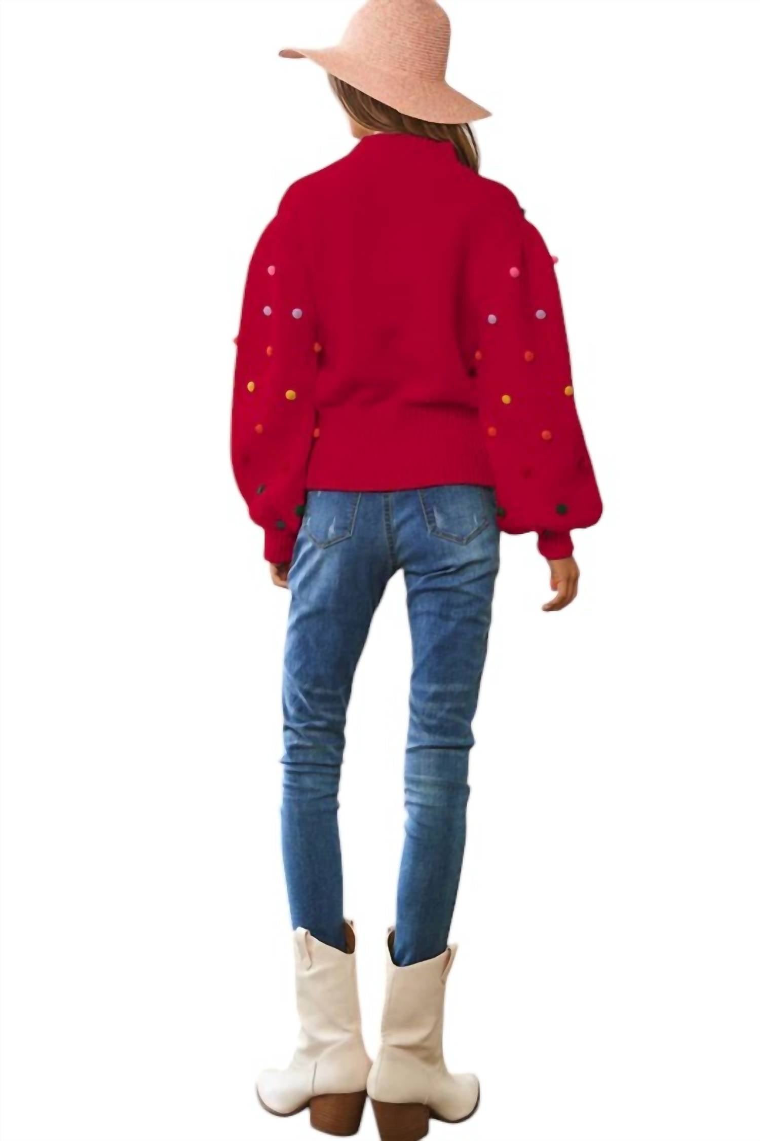 This mock neck sweater has long balloon sleeves with rainbow pompom trim. It is made from 52% acrylic, 28% nylon, and 20% polyester.