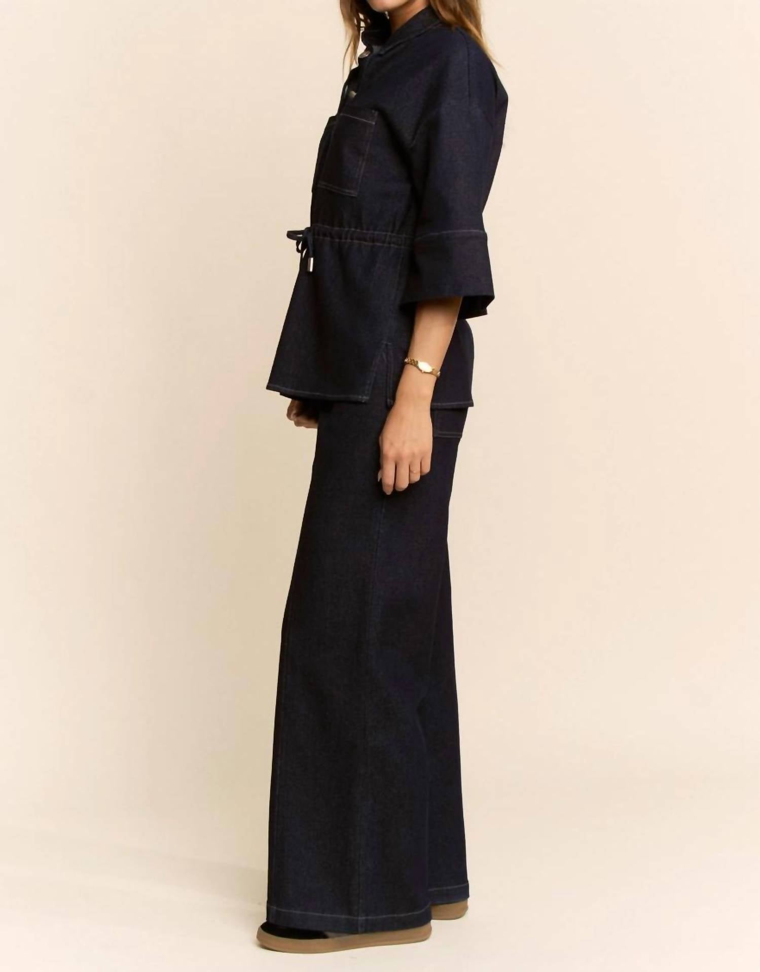 A set so cute you'll never want to take it off. Designed to look good while lounging, this little number is the perfect outfit for hanging at home in style. Elevate your streetwear style with the Denim Shirt Relaxed Pant Set by DAVI & DANI, perfect for concert outings. The shirt features a sharp collar and three-quarter sleeves, offering a modern silhouette in a solid dark wash. This women's loungewear set showcases a relaxed pant design crafted without revealing specific material details. Crafted with convenience in mind, this set embraces machine wash instructions for easy care.