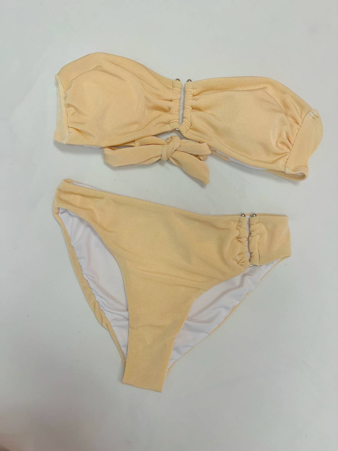 This cute and flattering swimsuit is perfect for making a splash at the pool, lounging on sun-kissed beaches, and staying stylish throughout the upcoming summer season. Introducing the Desert Sands Bikini Set by Davi & Dani, a chic and minimalist two-piece designed to enhance your beach style. This solid cream beige bikini features a timeless bandeau top with delicate straps that tie at the back for a customizable fit. Composed of 82% Polyester and 18% Spandex, the set includes mid-rise bikini bottoms offering medium coverage. Care instructions: Hand wash and lay flat to dry.