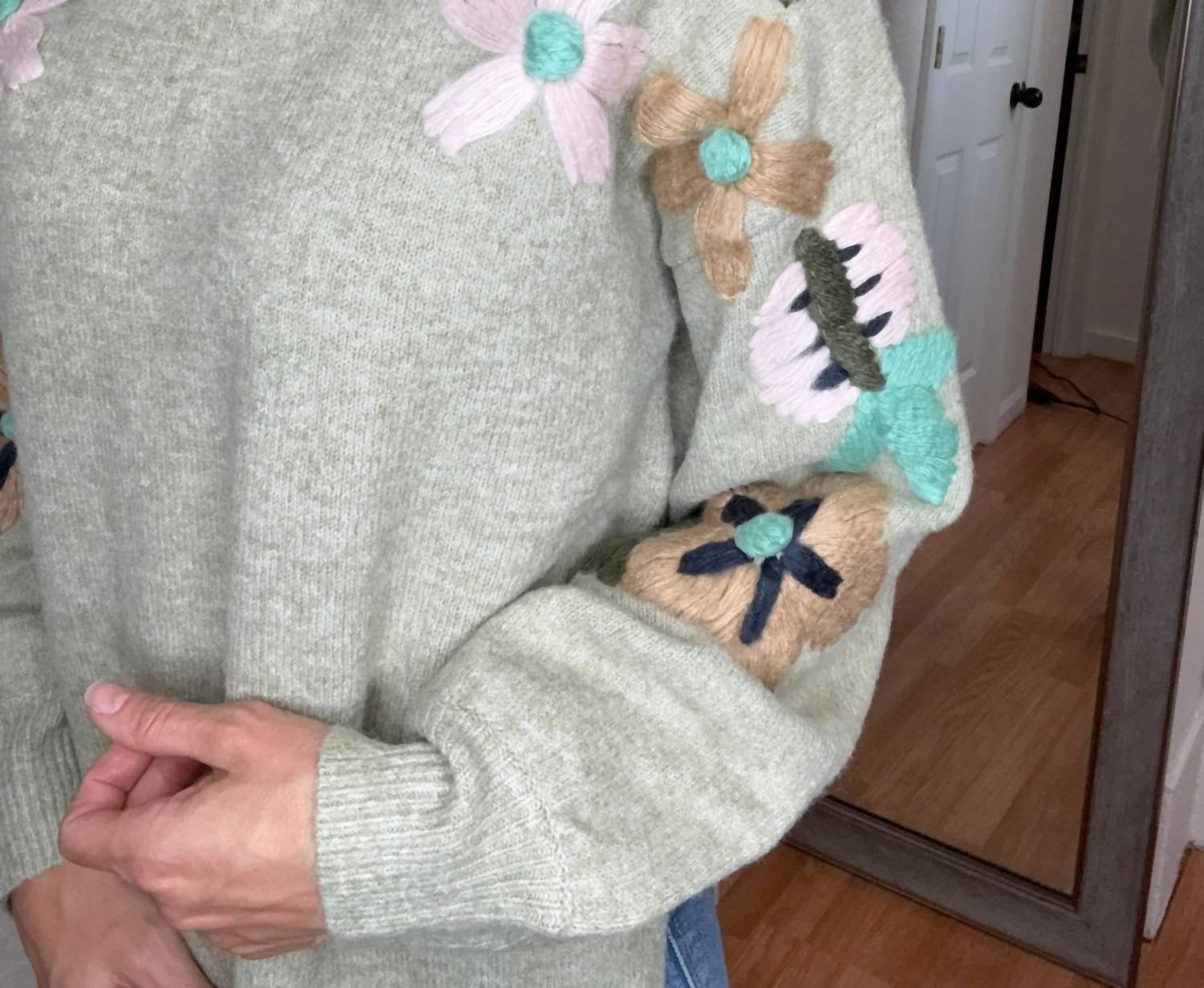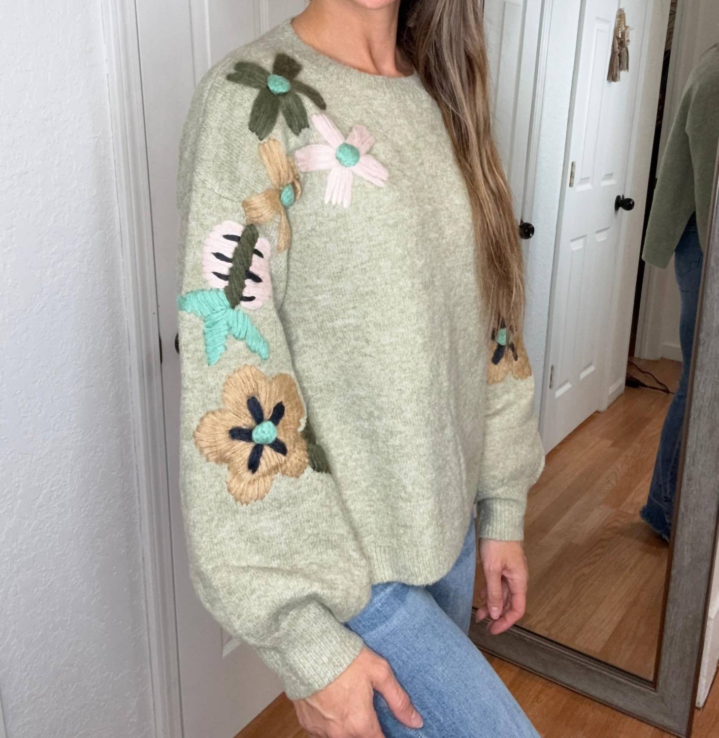 The ultimate go-to sweater, expertly crafted to provide the perfect combination of warmth and style. Its classic design and soft fabric make it a must-have addition to your wardrobe. Embrace comfort and style with the Tansy Sweater in Sage by Davi & Dani, perfect for cooler days. This women's sweater features long sleeves with ribbed trim, a crewneck design, and a relaxed fit with a slightly hi-lo hemline and side slits. Crafted from 75% polyester and 25% cotton, it offers a soft feel and amazing stretch for all-day wear. The knitted floral design down the arms adds a boho-chic touch, making it a versatile choice for travel or everyday elegance.