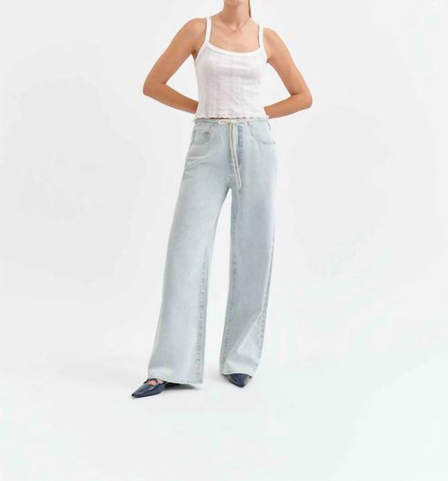 Pair these wide leg jeans with mules, slides or your favorite strappy sandals. Elevate your summer wardrobe with the Madison Mid Rise Wide Leg Jeans by DAZE in the delightful Baby Talk color. Crafted from cotton, these jeans are perfect for a relaxed fit with a wide leg silhouette and an 11" rise and 32" inseam for a flattering look. Featuring a convenient tie closure and functional pockets, they're ideal for vacation wear. Care instructions include machine washing for easy maintenance.