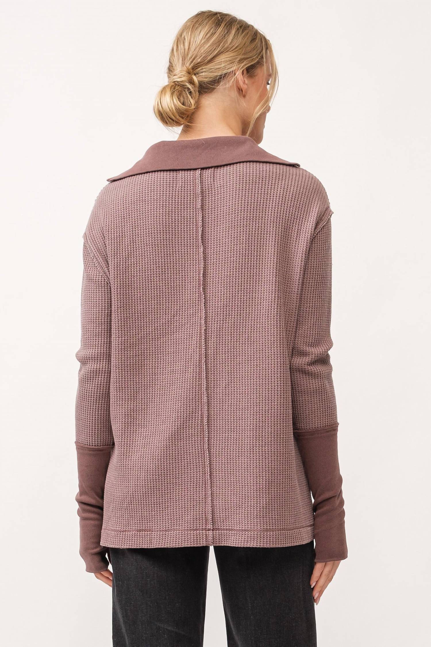 Meet the Tanya Marron Oversized Top by DEAR JOHN DENIM, a relaxed fit essential for your casual collection. Crafted from a soft blend of 65% polyester and 35% cotton, this long sleeve top offers enduring comfort and style. Featuring a V-neckline in a chic thermal design, it drapes effortlessly with a pull-on closure. Measurements for size small include a body length of 28", sleeve length of 24", and a bust of 46". Care for this brown wardrobe staple with a machine wash cold and tumble dry low.