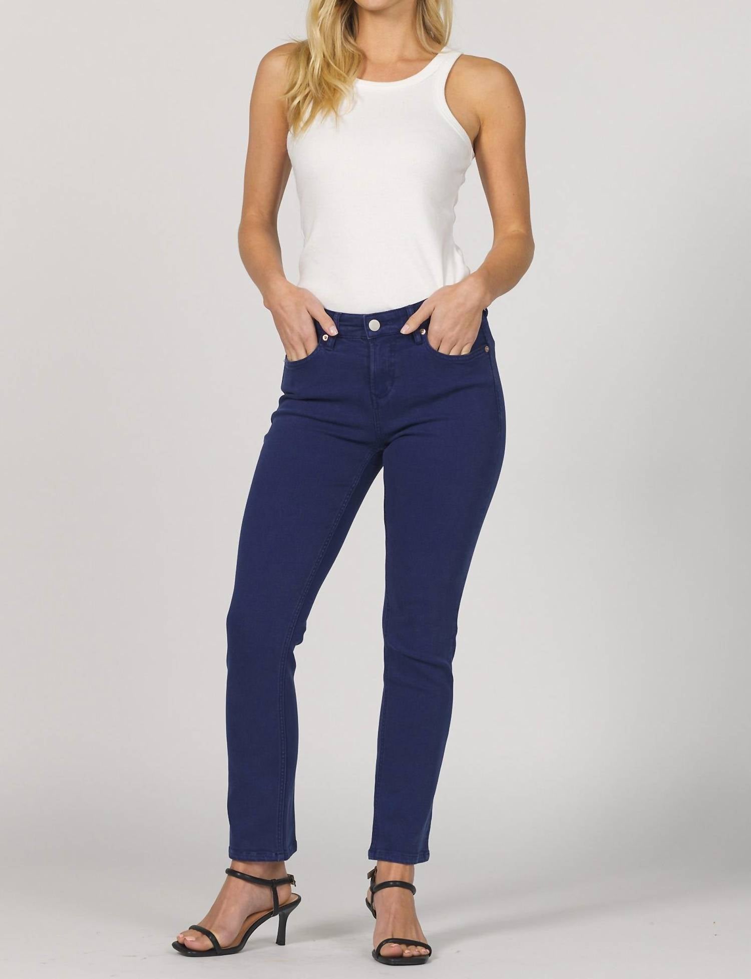 The perfect skinny pant for those stylish boots this season! Elevate your wardrobe with the Blaire Mid Rise Slim Straight Jeans by DEAR JOHN DENIM in the sophisticated Naval Academy shade. These women's jeans offer a versatile style perfect for both professional and casual settings, featuring a mid rise waist with a 9.5" front rise, slim fit, and straight leg cut. Crafted from a comfortable cotton blend of 90% Cotton, 8% Polyester, and 2% Spandex, they provide just the right amount of stretch. The jeans come with a zip fly and button closure, a classic five-pocket design, and an inseam length of 30".