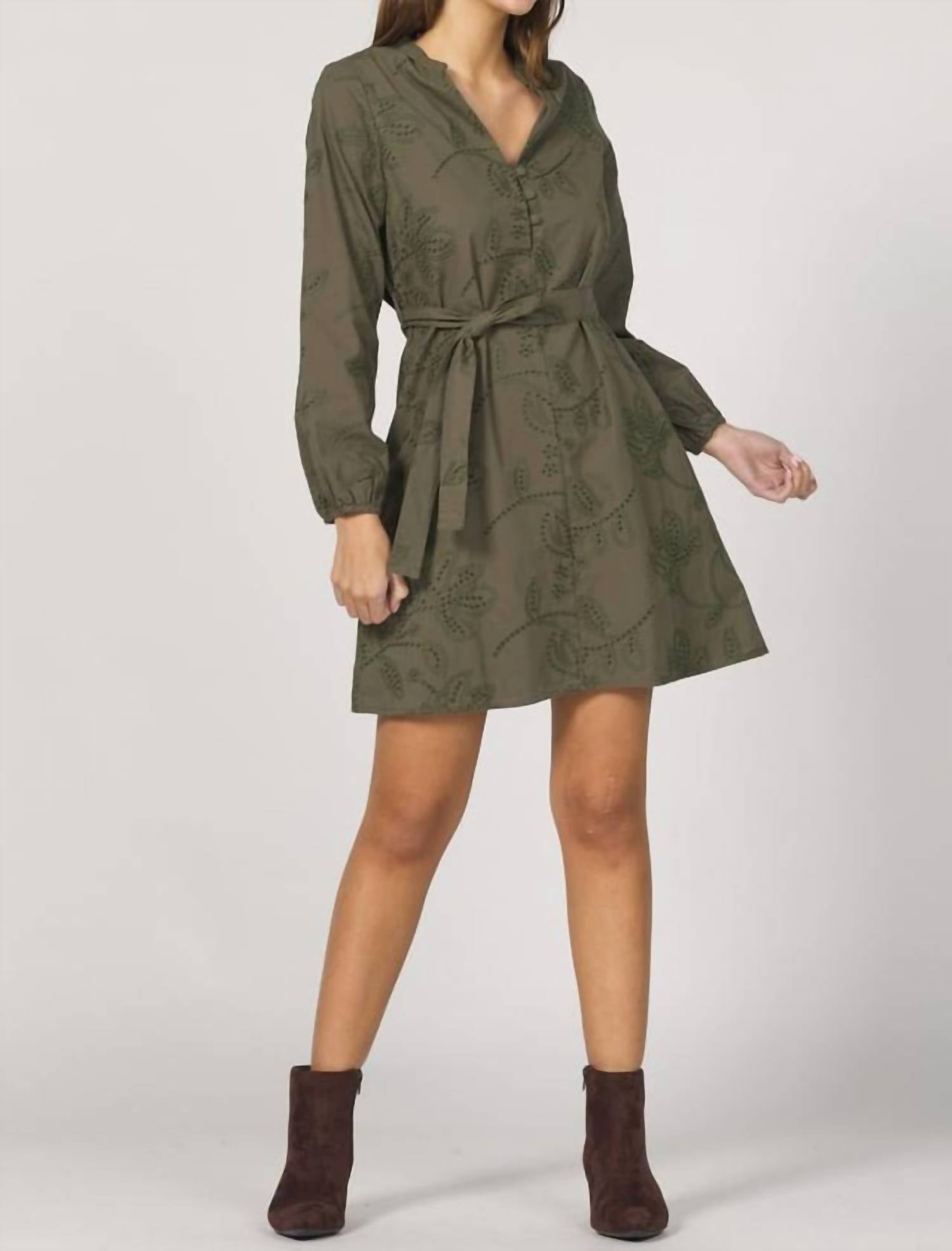 The kind of easy and flattering dress you'll be reaching for all season long. Introducing the Christine Embroidered Dress by DEAR JOHN DENIM, a perfect blend of style and comfort in a rich Vetiver hue. This women’s sheath dress features long sleeves and a V-neckline, showcasing intricate embroidery that elevates its elegant mini-length design. Crafted entirely from 100% cotton, it's tailored for breathability and comfort, ideal for holiday parties or casual gatherings. Closure: Button closure.