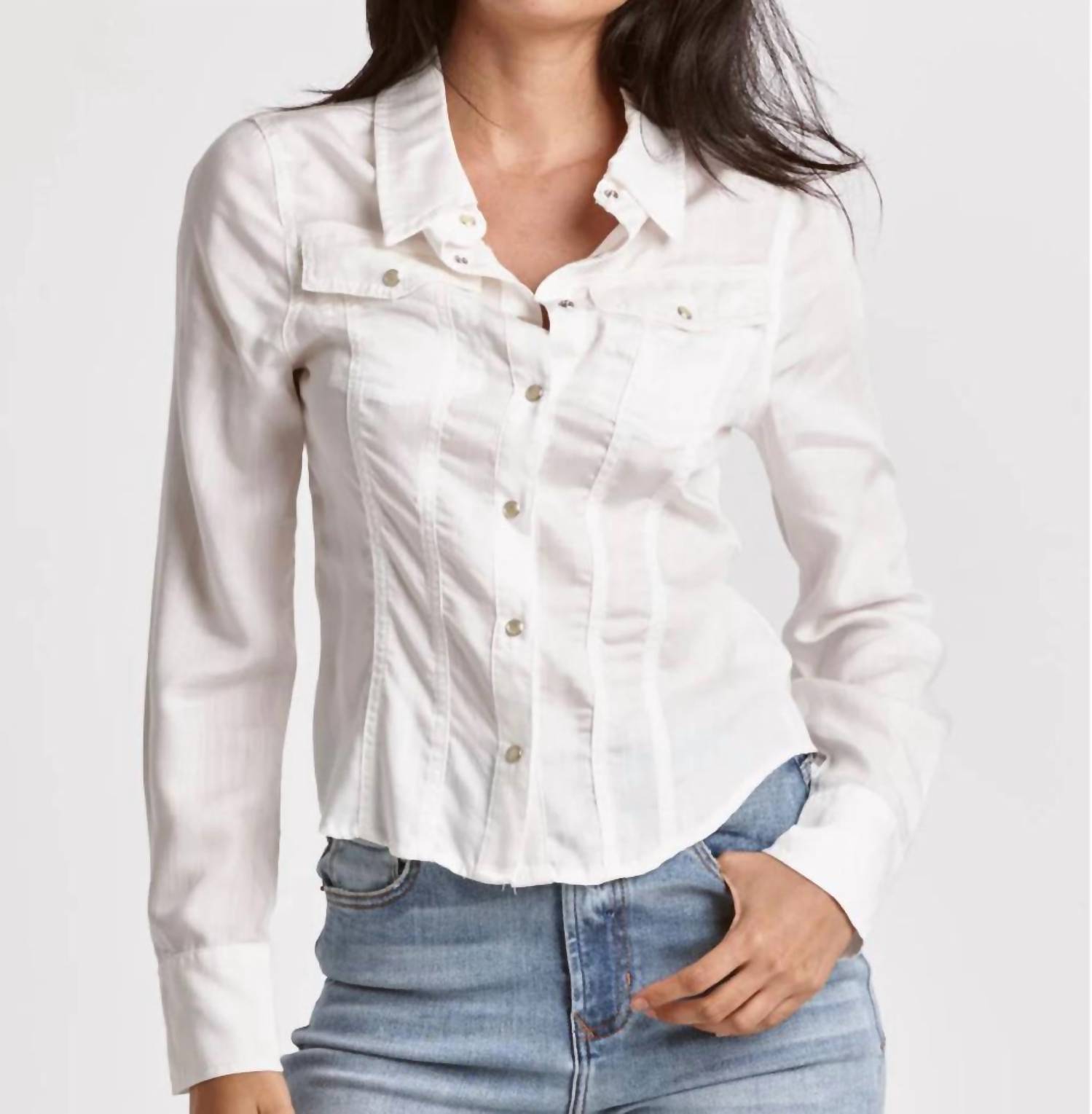 This button down shirt is comfortable yet polished. Experience the quintessential blend of sophistication and modern style with the Uma Soft Denim Long Sleeve Shirt by Dear John Denim. This exquisite piece sports long sleeves and a refined collar, featuring a pearl snap closure that adds a chic flair. Constructed with 100% TENCEL, this imported shirt offers both comfort and breathability, boasting a solid pattern and practical patch front pockets. Measuring a body length of 24" and sleeve length of 24" for a size small, it flaunts a bust of 37", and is easy to care for with machine wash cold and tumble dry low instructions.