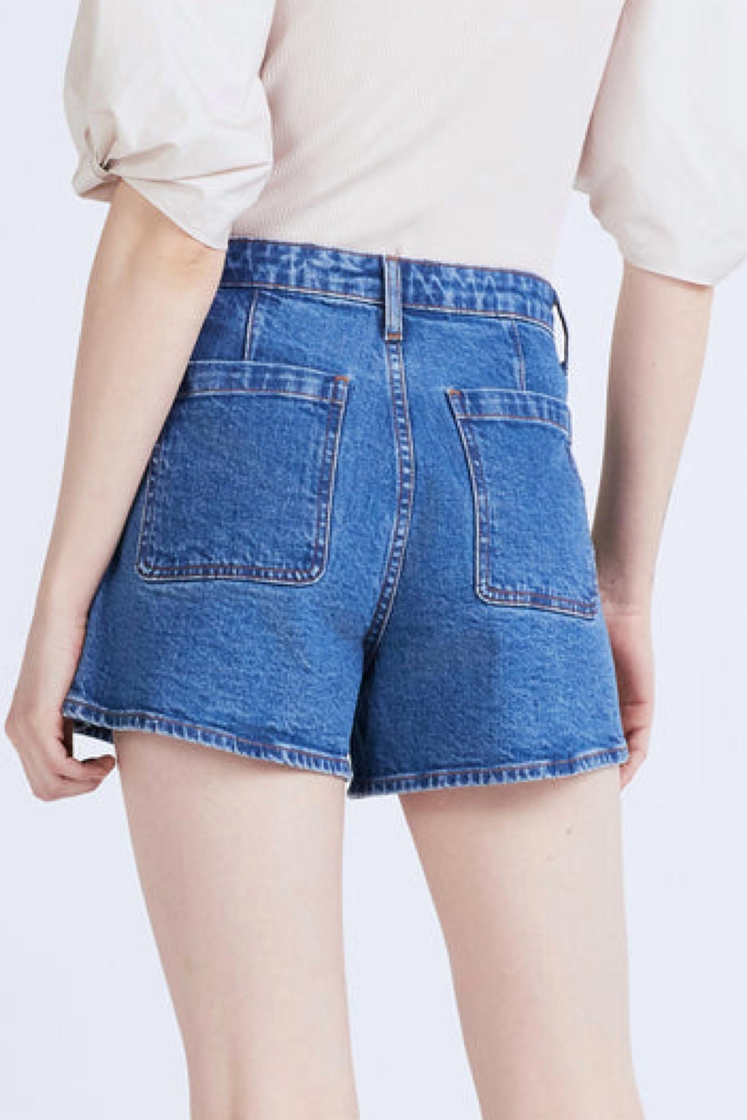 Jean shorts so versatile, you can literally wear them with anything. Embrace summer style with the Luna High Rise Short by Derek Lam 10 Crosby, crafted in a solid blue wash perfect for vacation wear. These jean shorts feature a 3 3/4" inseam and are made with a blend of 92% Cotton, 6% Elastomultiestere, and 2% Elastane for a comfortable fit. Designed with woven braid patch pockets, zip fly closure, and belt loops, they offer both functionality and a trendy Y2K aesthetic. For care, turn the garment inside out and machine wash on a cold gentle cycle, followed by tumble drying.