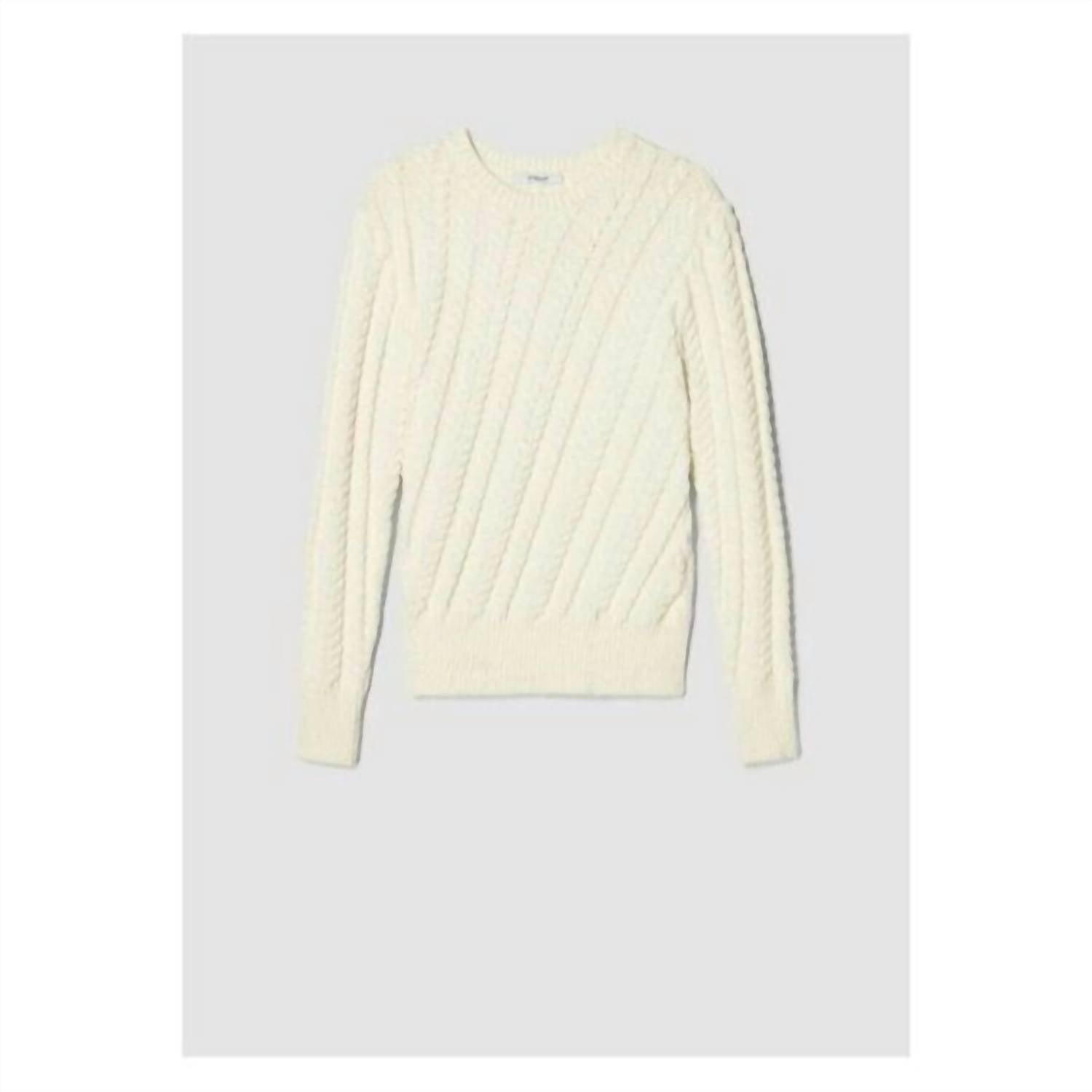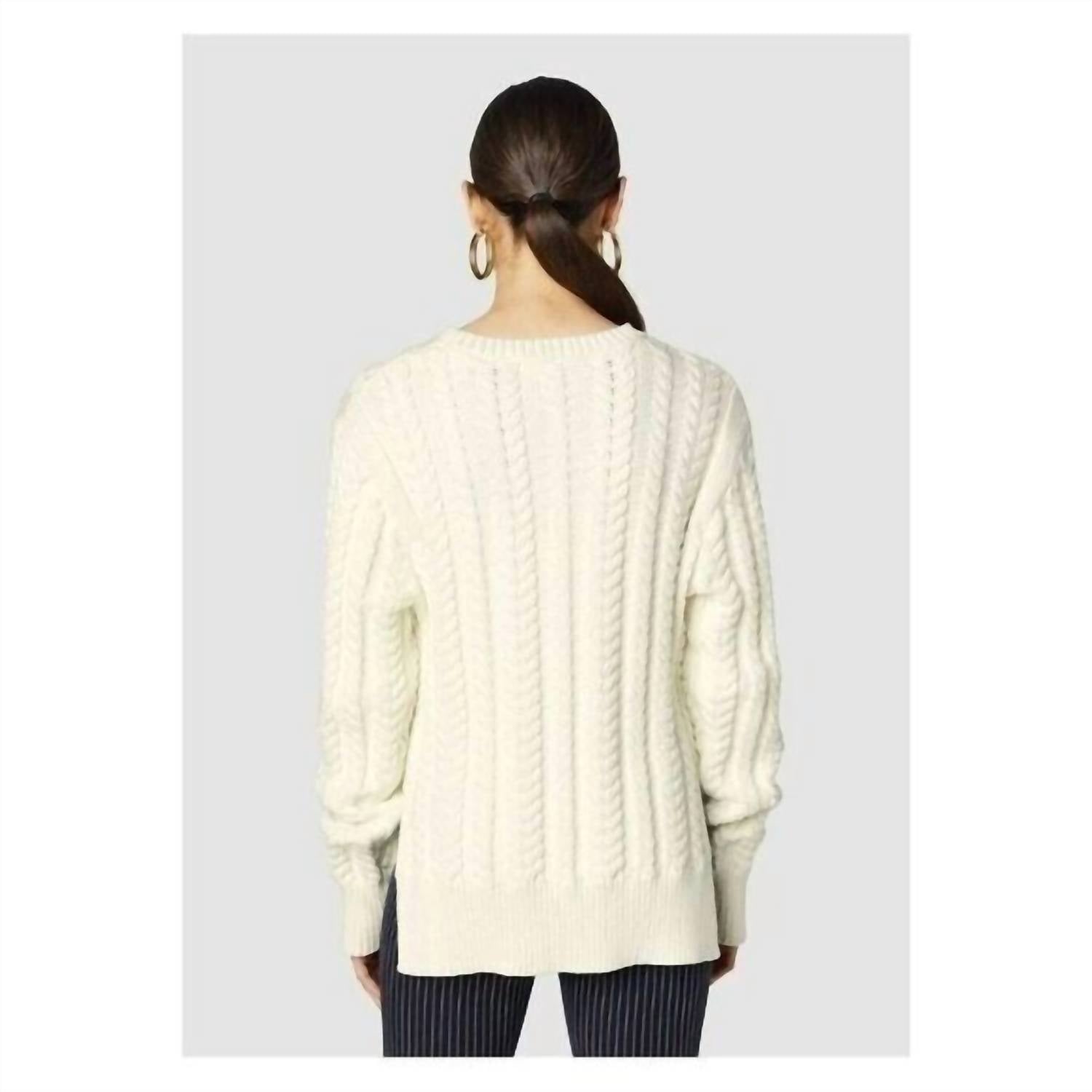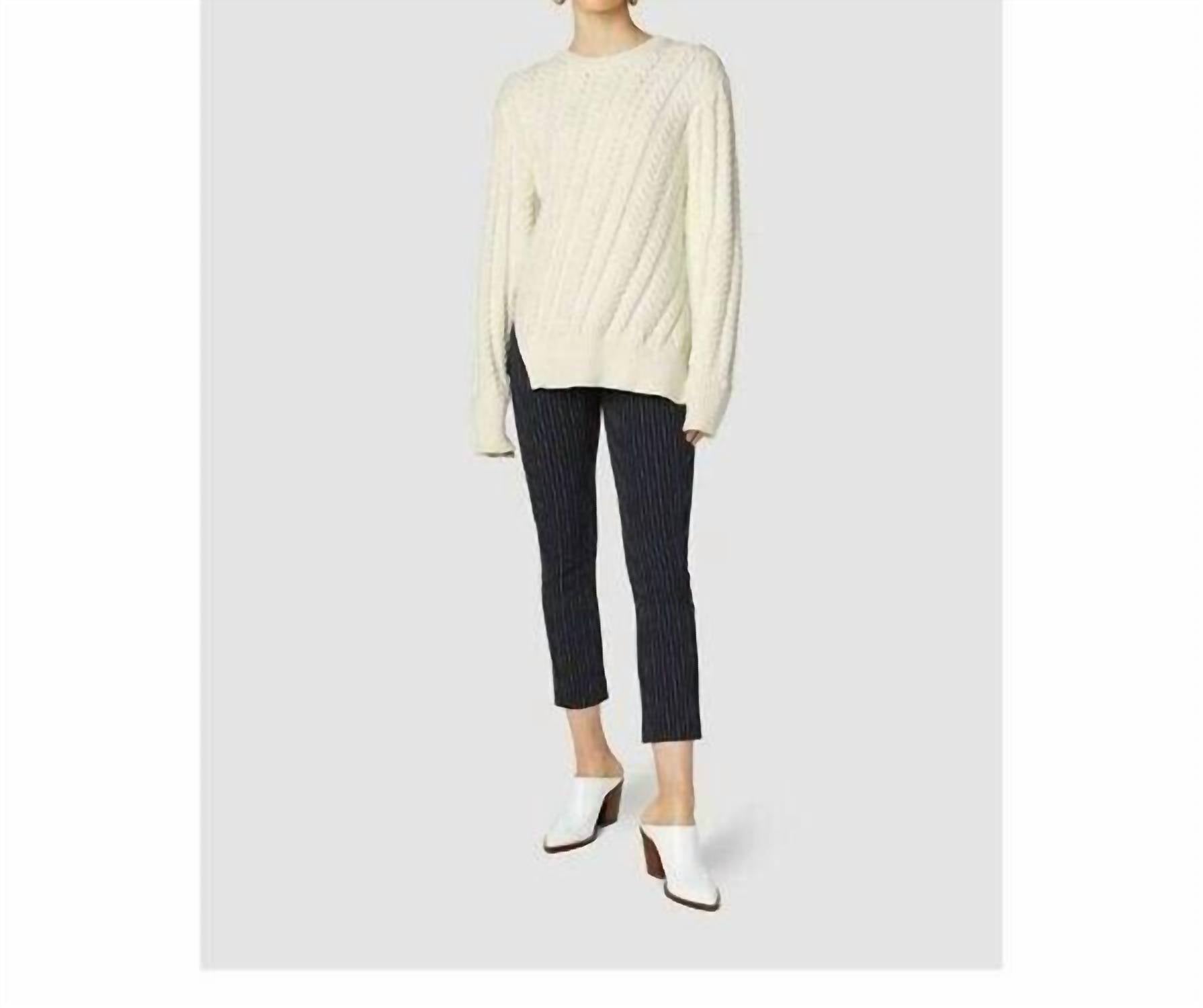 Experience the perfect blend of comfort and style with this trendy crew neck sweater, designed to effortlessly elevate your wardrobe. Pair it with your favorite denim and loafers for the perfect look. Slightly oversized off-white crew neck pullover in an angled cable knit stitch Ribbed neckline, cuffs, and hem. Angled side slit detail 55% Cotton, 45% Nylon Dry Clean Length 25"