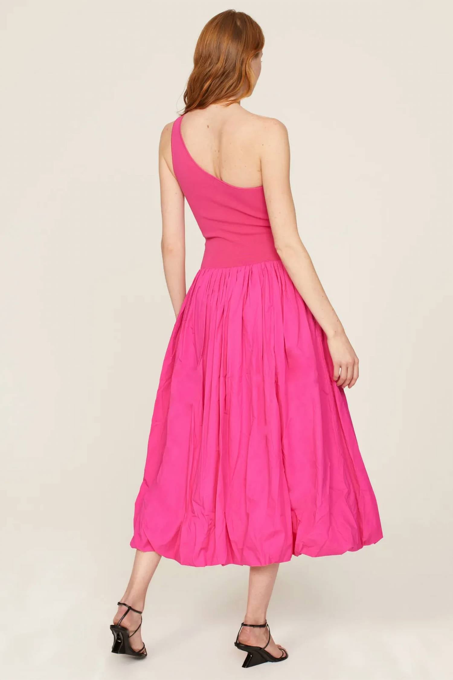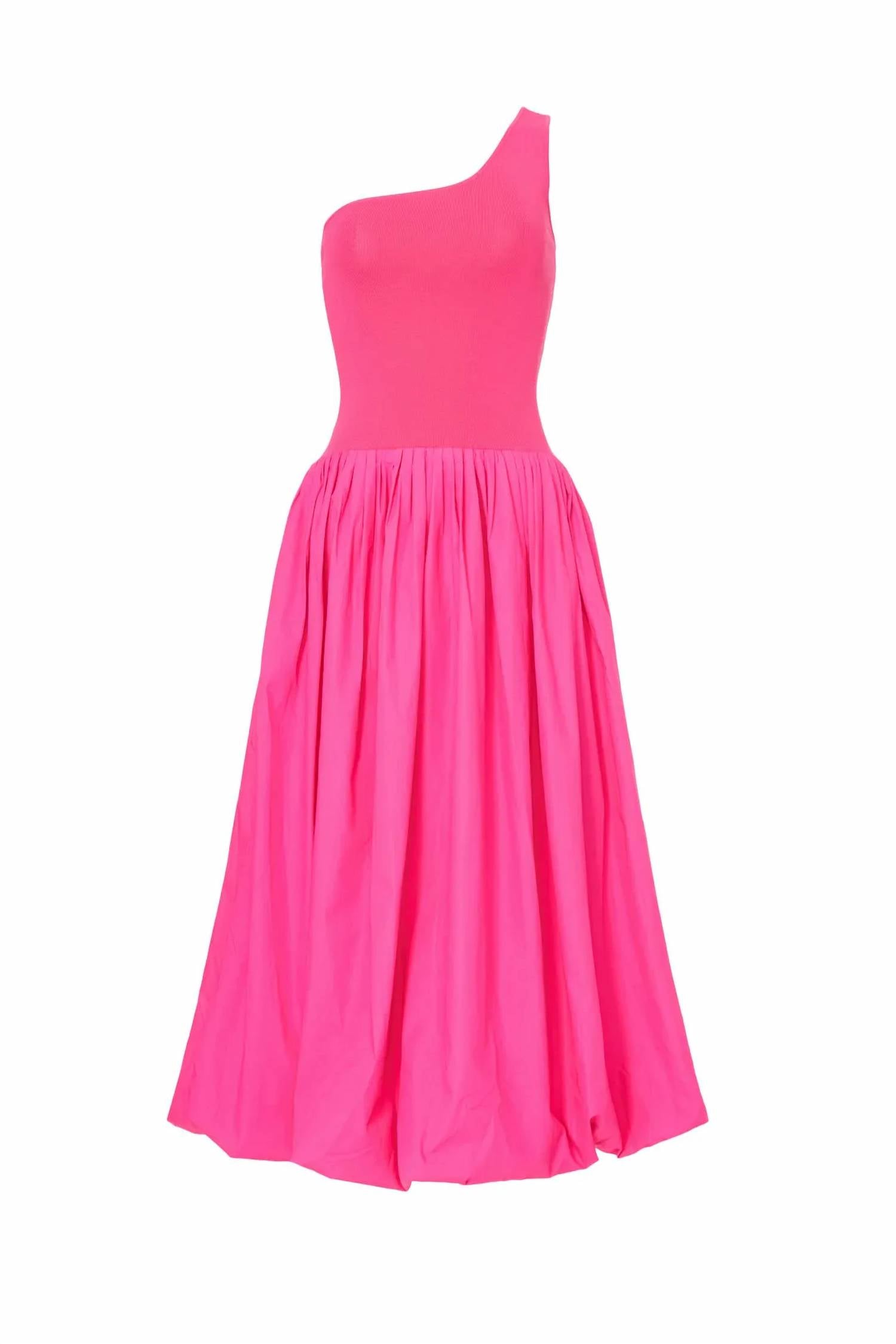 Perfectly tailored and fit to perfection. Embrace elegance with the One Shoulder Midi Dress by Derek Lam 10 Crosby, perfect for dinner parties or Valentine's Day soirées. This pink, solid A-line gown features a drop waist and a playful bubble hem, crafted from a viscose blend of 65% Viscose and 35% Nylon. Designed in a sleeveless, one-shoulder style, it measures 52.5 inches from shoulder to hem. Originating from China, this dress has a convenient pull-on closure and requires dry cleaning to maintain its minimalist charm.