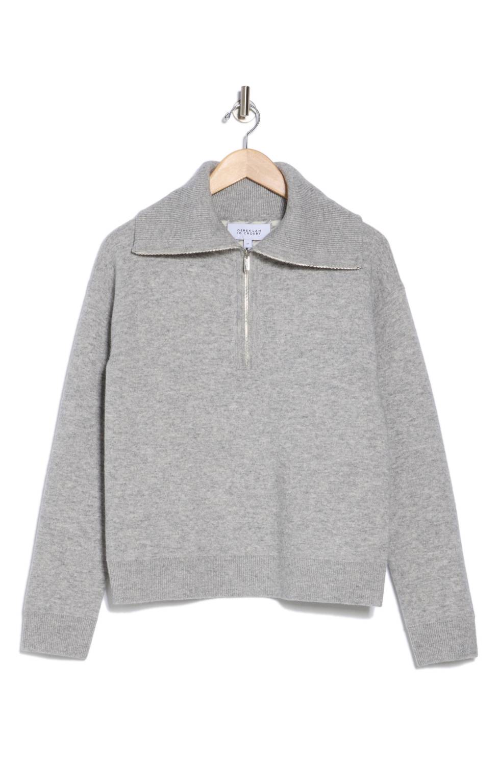A timeless v-neck sweater that works season after season. Introducing the Samuel Reversible Quarter-zip Pullover Sweater by Derek Lam 10 Crosby, an elegant piece perfect for any woman's wardrobe. Crafted from a premium blend of 86% wool, 10% cashmere, with 3% other fibers and a touch of spandex, this 24-inch long sweater is expertly designed for comfort and warmth. Featuring long sleeves and a wide ribbed collar, it offers a cozy feel in a light heather grey solid pattern. With its zip closure and the brand's hallmark style, this imported piece requires dry cleaning to maintain its luxurious quality. The model is 5'10" with a bust of 31.5", waist 23", and hips 36", wearing size S.