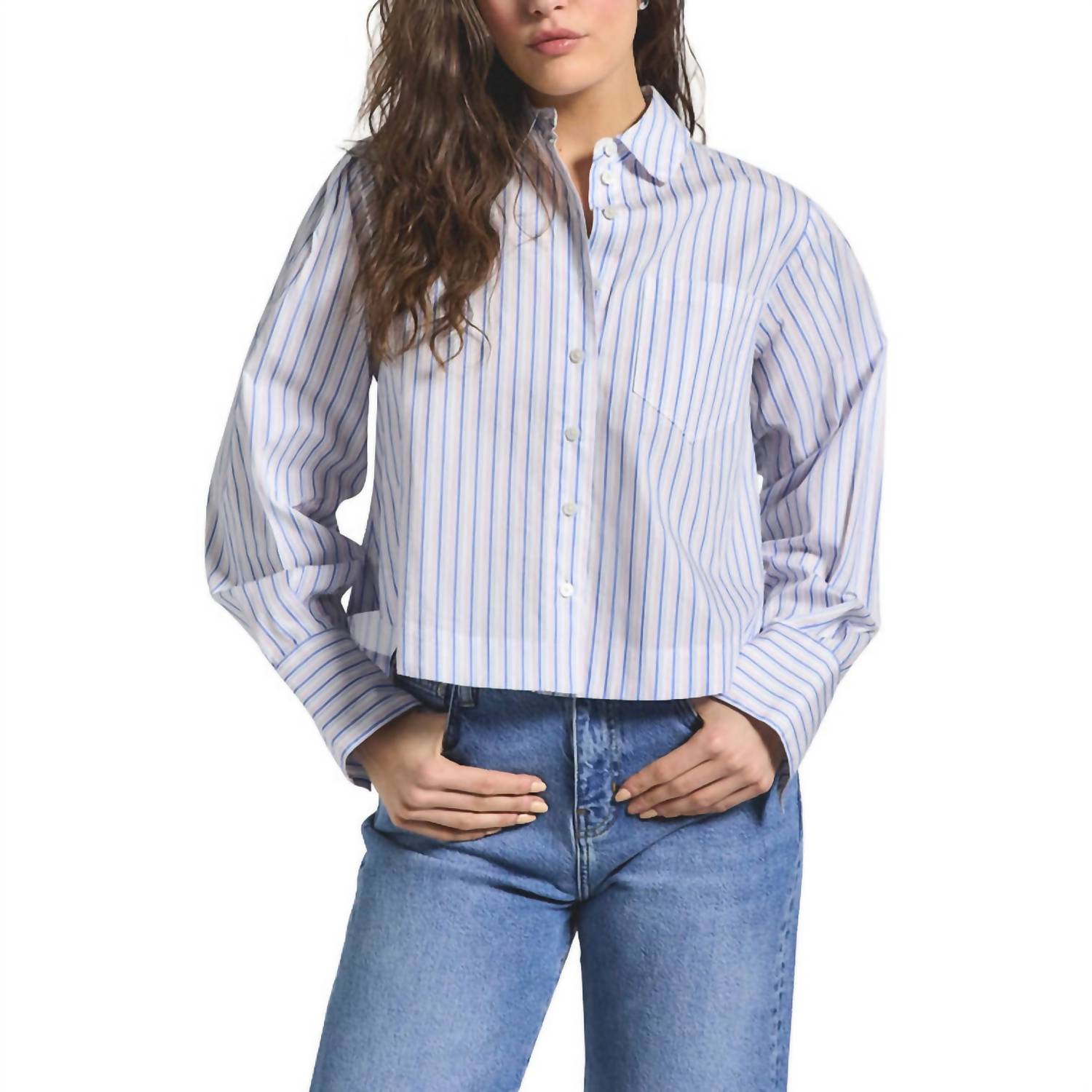 Introducing the Women's Button Down Shirt by Derek Lam 10 Crosby, a chic addition to your vacation wardrobe in Blue Multi. This long sleeve top features a classic collar and a striking striped pattern, making it perfect for spring streetwear. The button closure ensures a polished look, while the lightweight design suits any occasion. A versatile piece that effortlessly complements your fashion-forward collection.