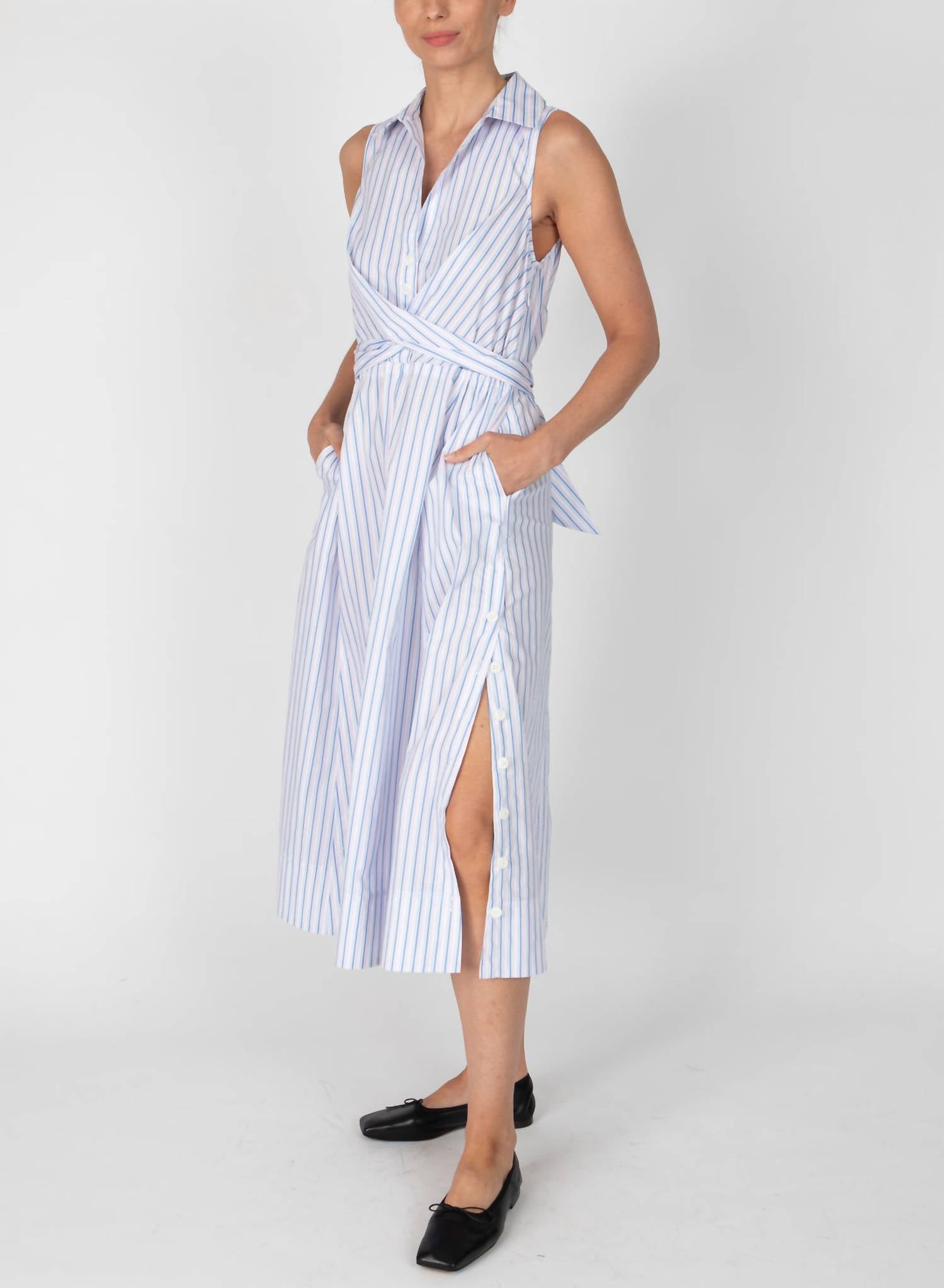 The perfect length dress does exist. Discover the Shanaya Front Wrap Dress by Derek Lam 10 Crosby, a captivating Blue Multi midi dress styled with a trendy boho chic flair. This sleeveless dress features a striped pattern and a distinguished collar neckline. With a convenient button closure, it is designed with functionality in mind, including handy pockets. Perfect for a spring vacation, this dress offers effortless style wherever you go.