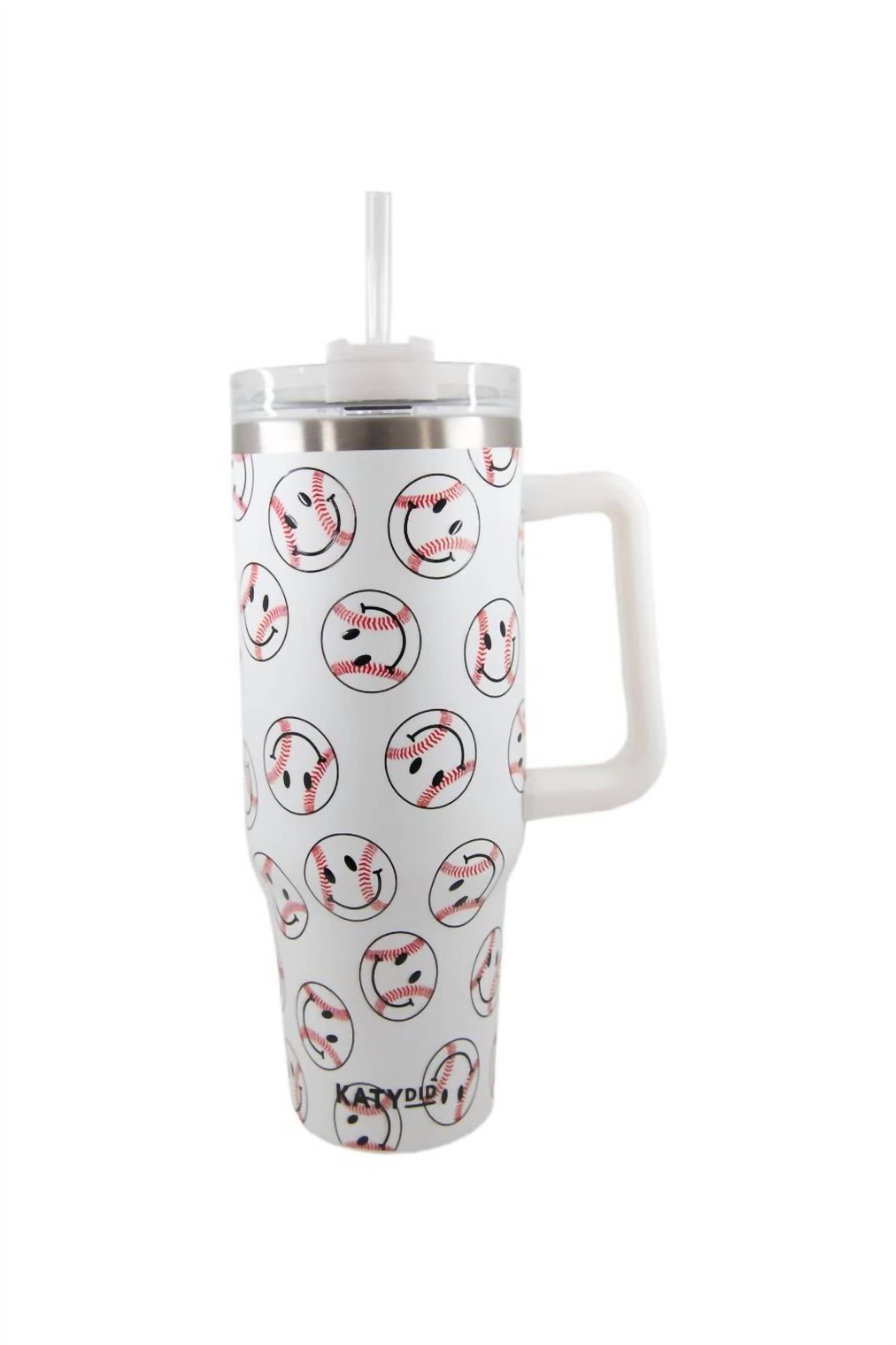 Sip in style with the Baseball Happy Faces Tumbler Cup by Katydid, a perfect choice for those who love the game. This 40-ounce drinkware piece comes in a crisp white and features a stainless steel interior, ensuring your drinks stay just right throughout the day. The tumbler includes a reusable plastic straw, a screw-on plastic top with a straw opening, and an adjustable straw cover for convenience. With dimensions of 3" width, 3" depth, and 10" height, it fits easily into most car cup holders, and while solid colors are dishwasher safe, hand washing is recommended for printed designs.