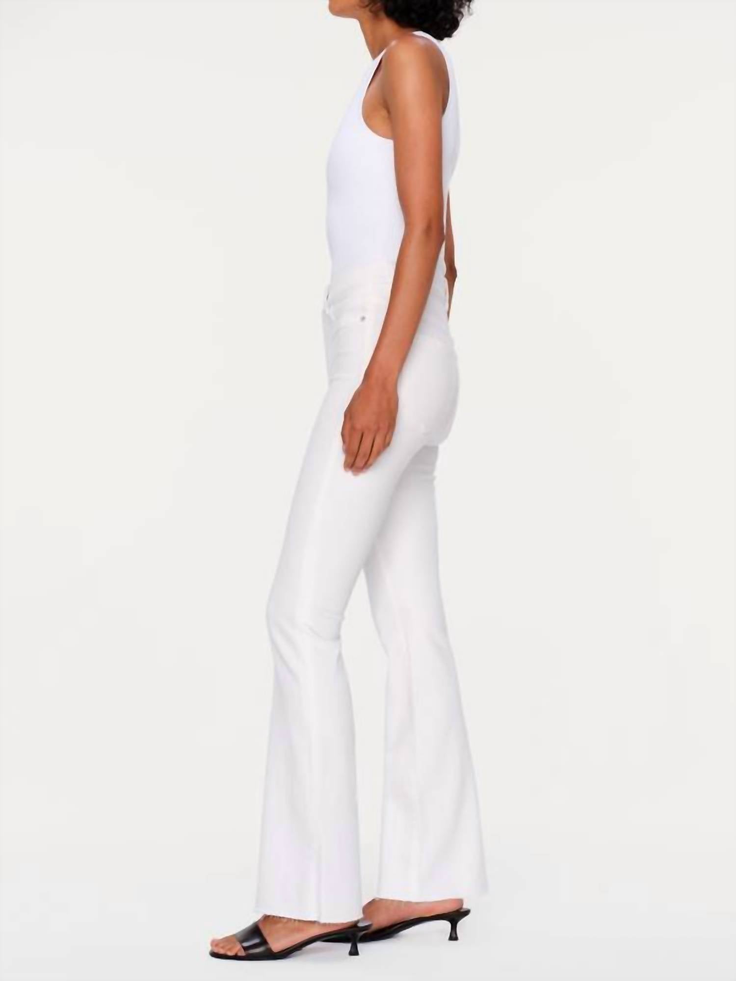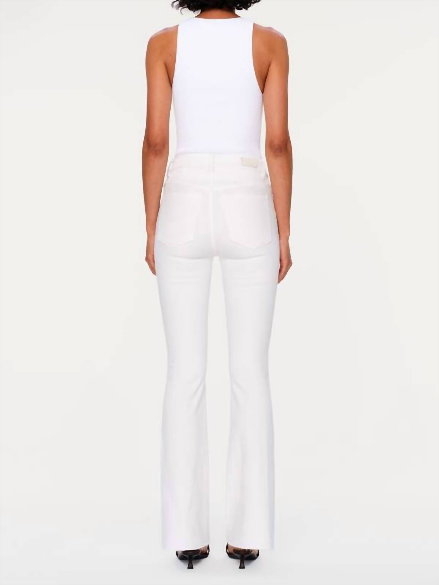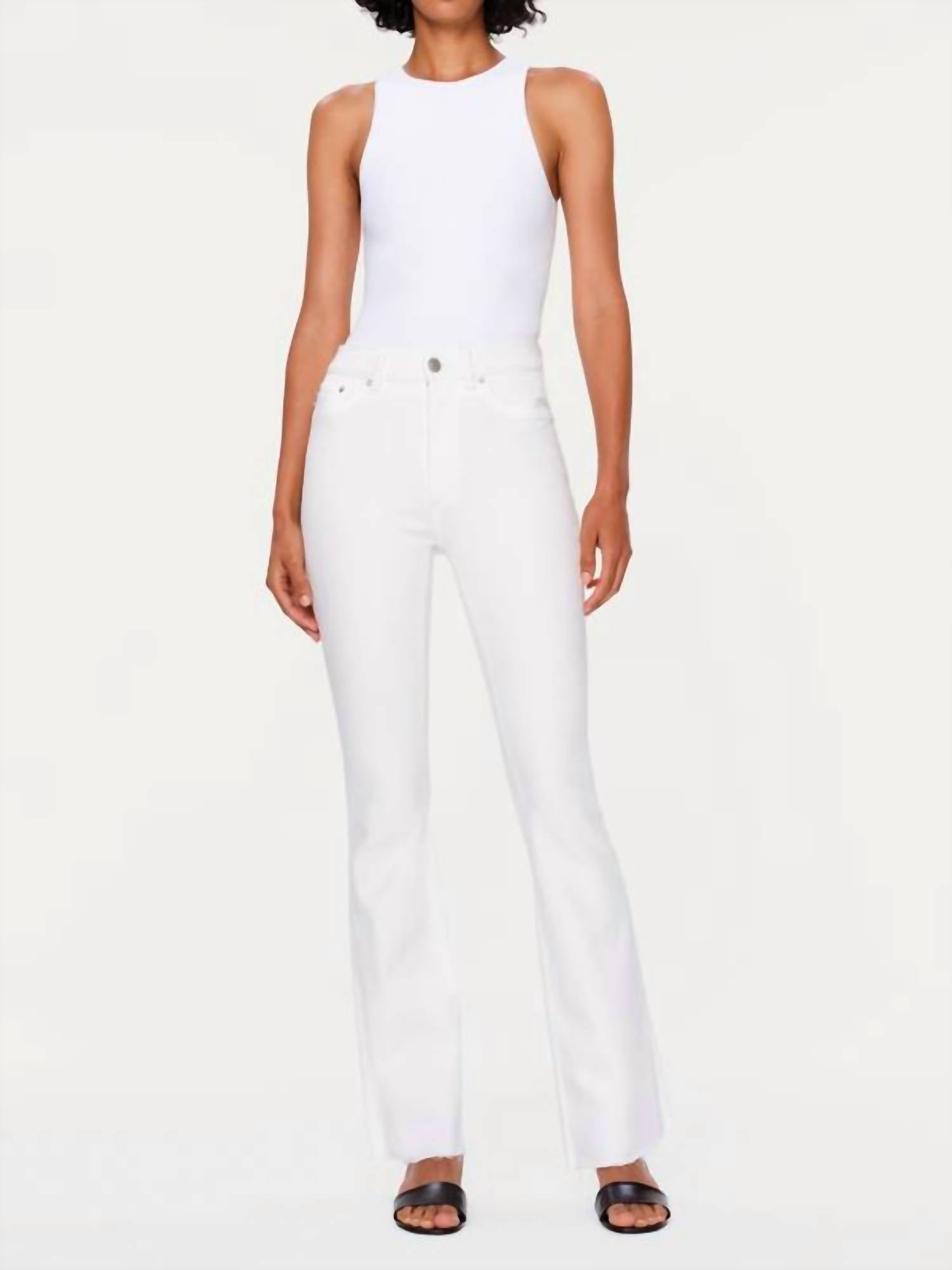 Fit to perfection, we love these high-waist jeans and you will too. DL1961 presents the Bridget Boot High Rise Instasculpt Jeans, crafted in a chic white cotton blend for a stylish silhouette. These bootcut jeans feature a 31.5-inch inseam and a 10-inch high rise, perfect for creating a timeless look. The solid pattern enhances their adaptability for a variety of summer vacation ensembles. Closure: Button closure. Designed with pockets for practicality, they embody minimalist elegance.