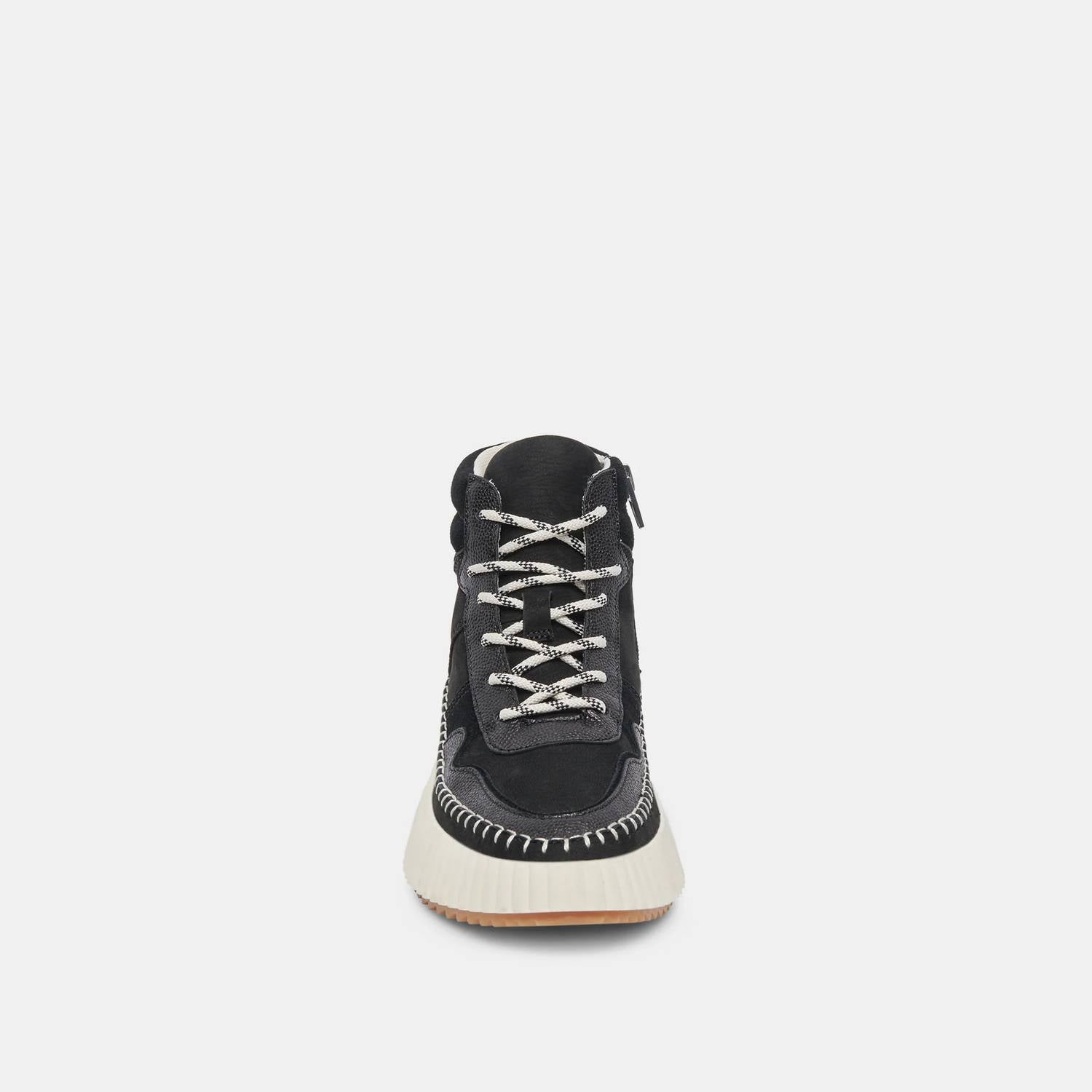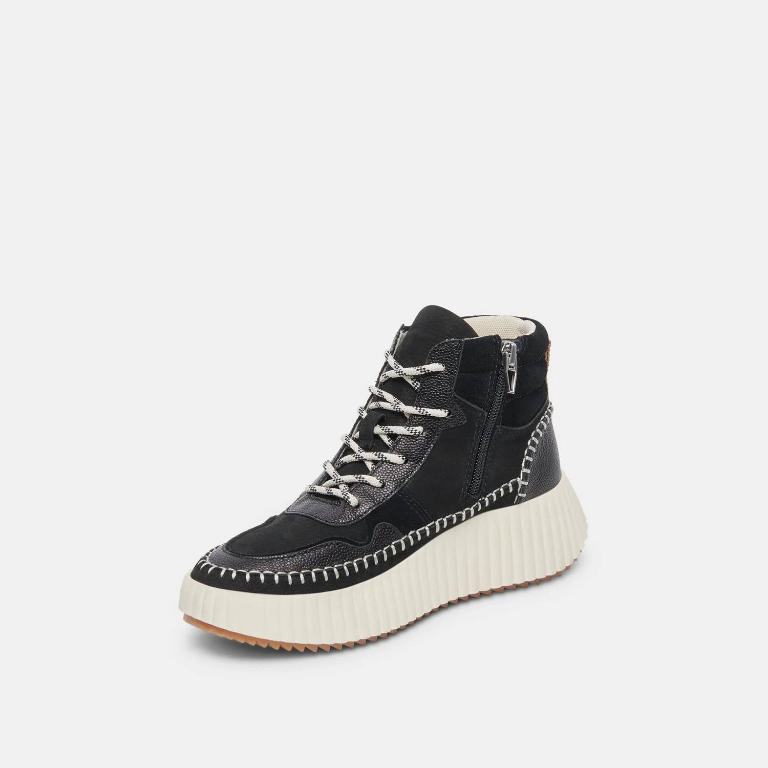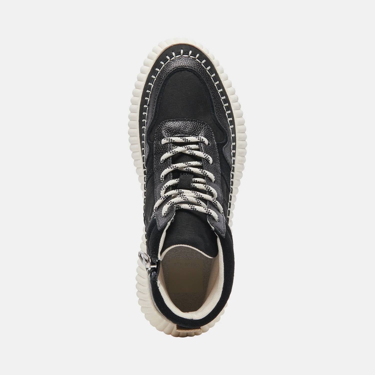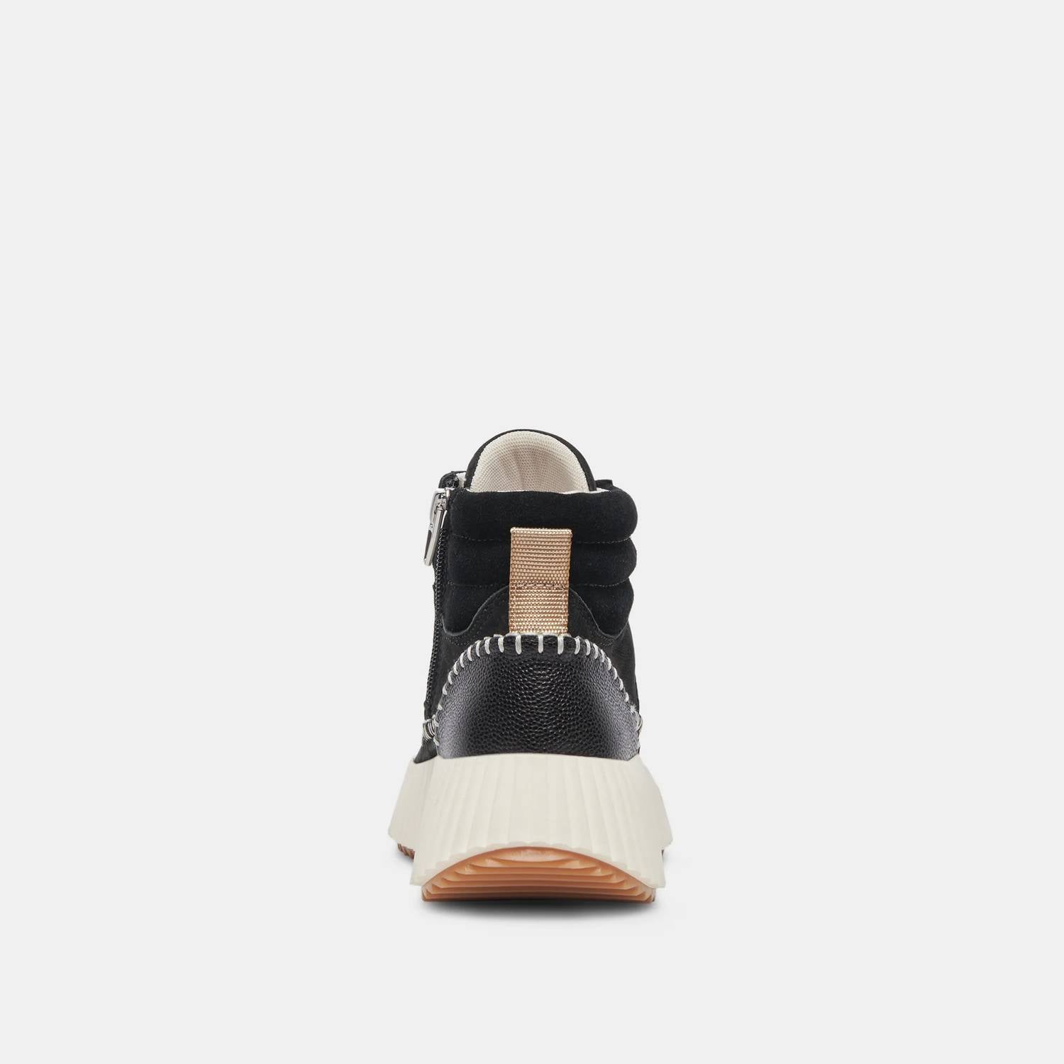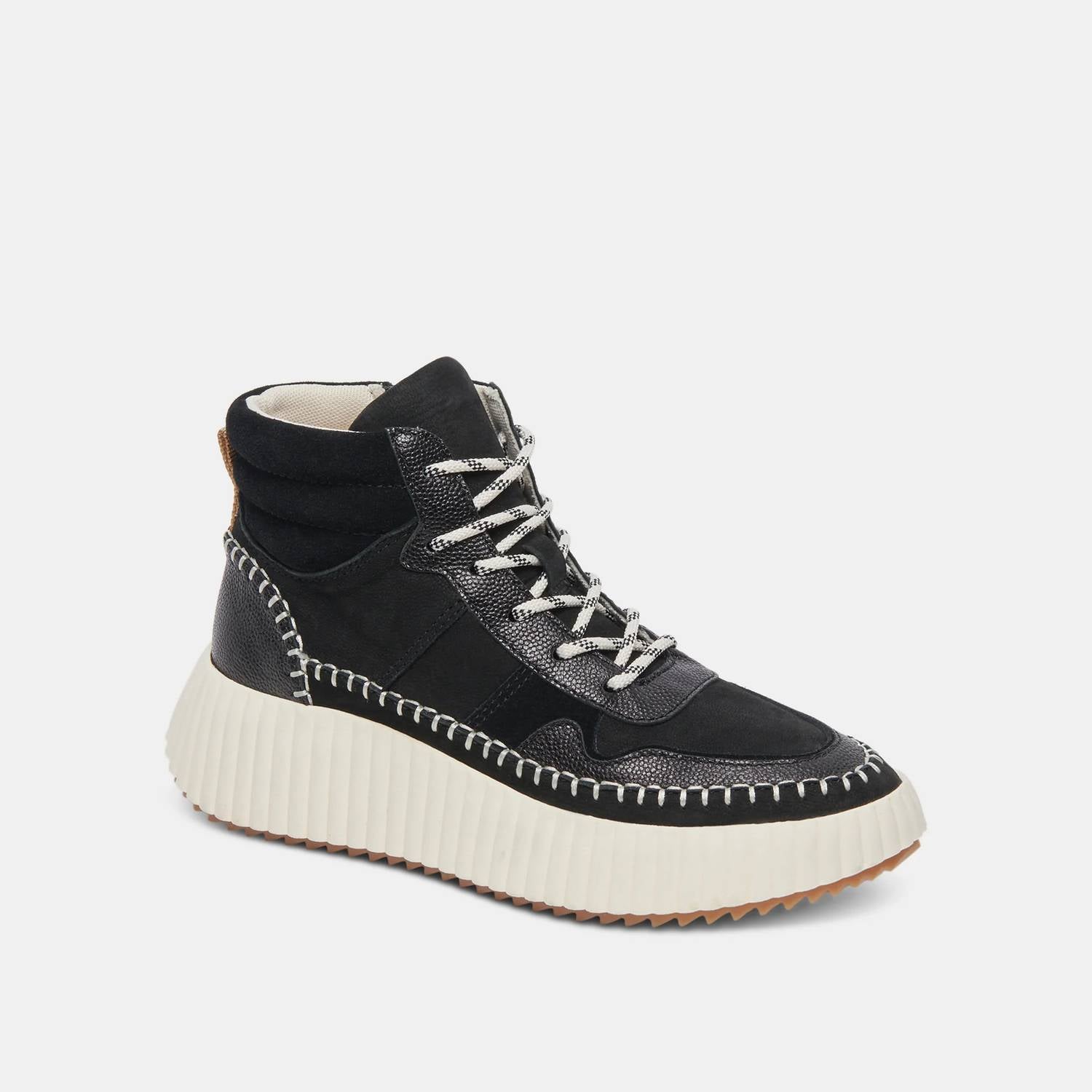 Get your daily steps in with these adorable sneakers. Elevate your fall wardrobe with the Women's Daley High Top Sneaker by Dolce Vita in Black Multi Suede. Designed for both style and comfort, these sneakers feature a leather upper, a platform rubber sole with a 1.6" heel, and a 1" shaft height. The shoe is finished with a rubber outsole, mesh lining, and a synthetic sock, ensuring a perfect fit with a 10" leg circumference. Ideal for travel and streetwear, these sneakers will seamlessly blend into your everyday look.