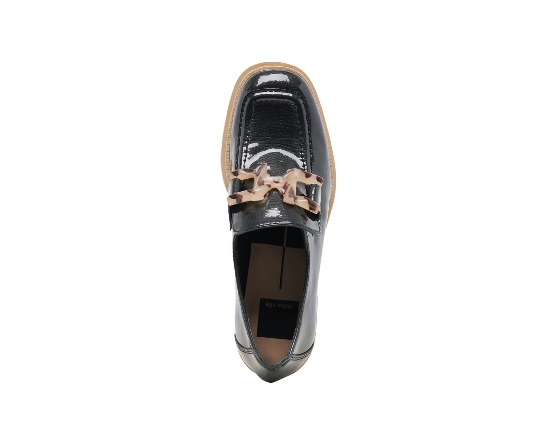 A preppy yet feminine take on the classic loafer. Embrace vintage-inspired style with the Women's Harold Loafer by Dolce Vita in Midnight Patent Leather. This loafer features a block heel with a 1.2" height, complemented by a 0.4" platform for added lift and comfort. The construction includes a leather upper, recycled synthetic outsole, and a cushioned recycled cotton twill lining. Designed with a round toe and modern chain detailing, this shoe is a chic choice for both mini skirts and wide-leg denim. Imported and crafted with at least 20% recycled material content, it's perfect for a spring dinner party or New Year's Eve celebration.